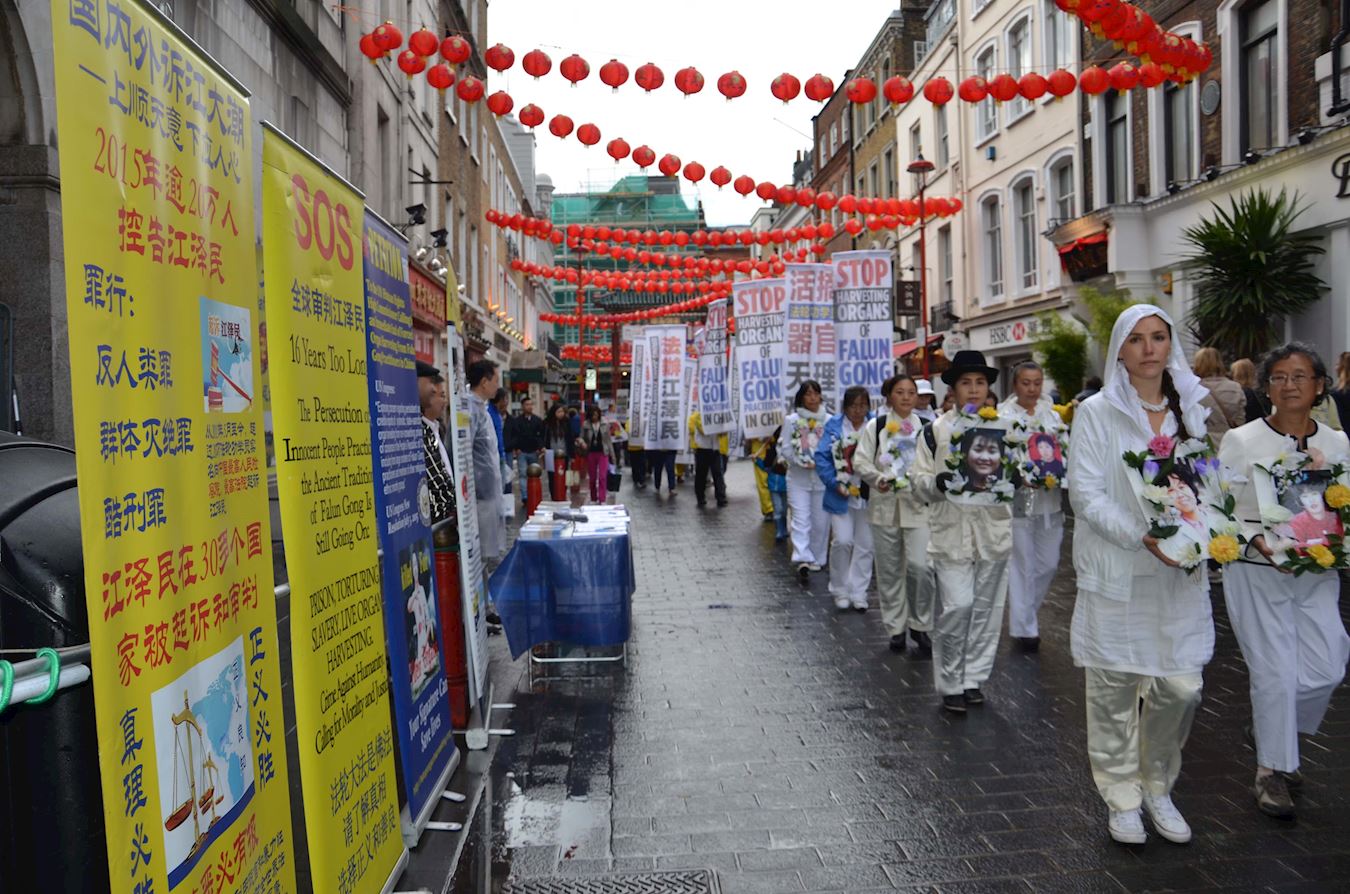 法轮功学员周末在伦敦唐人街讲真相反迫害已有多年,但声势浩大的法轮功游行队伍的出现仍然给唐人街上的店家和游客带来震撼。游行队伍经过后,一对年轻人拿着一份真相传单看得很专注,其中女士看来以前听过真相,正在给男士解释传单上有关中共活摘器官的内容。一位法轮功学员上前向他们进一步揭露中共活摘器官罪行,并讲述法轮功学员反迫害、反活摘的基本诉求,男士听后立即对法轮功学员表示支持说:“这是很正的事情,我祝愿你们成功!”