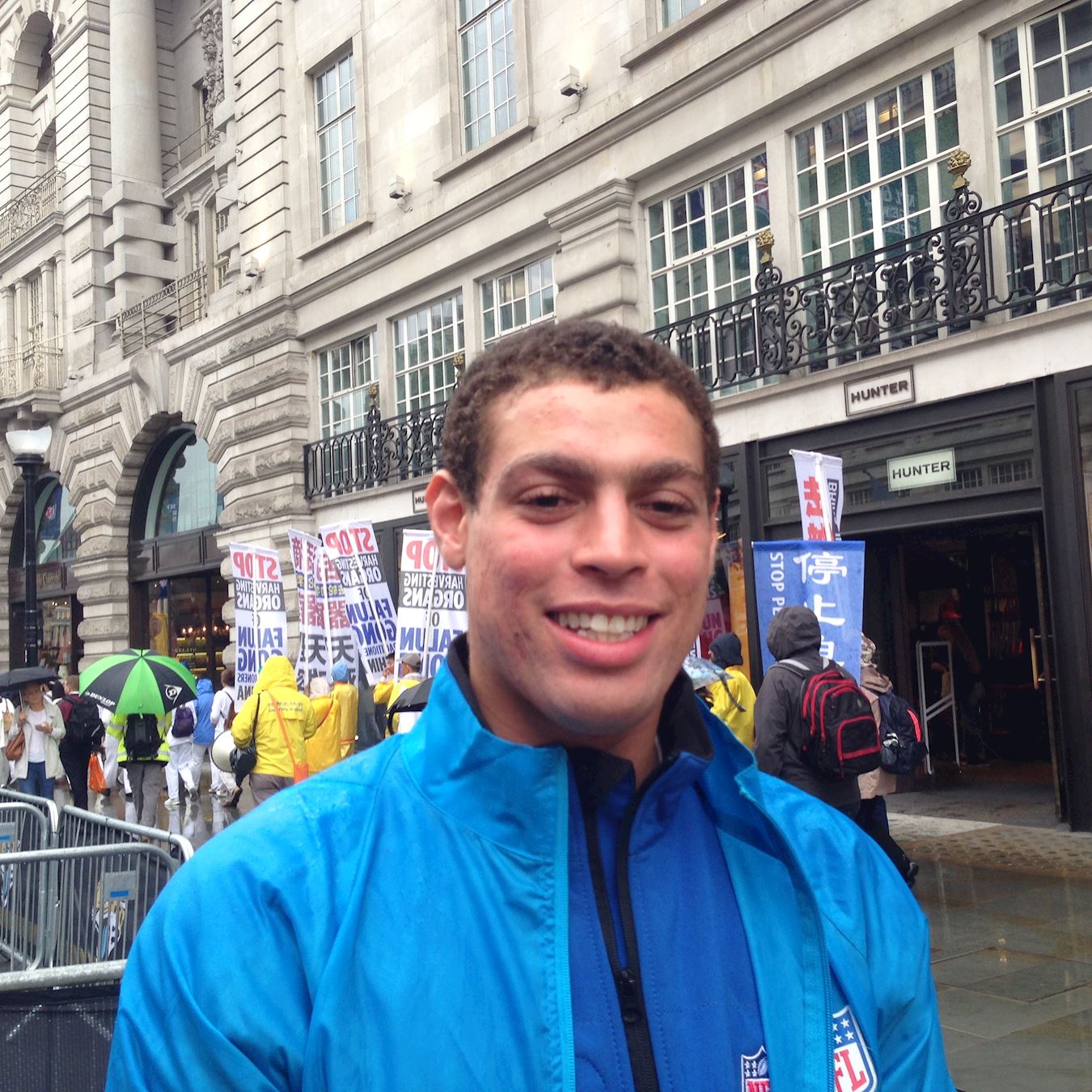 英国小伙子(Lee)是当天全国足球联赛(NFL)在伦敦摄政大街上组织活动的一位工作人员,法轮功游行队伍经过时他站在一边认真观看,他表示自己以前听说过法轮功真相,对法轮功学员的游行表示赞赏,他说:“应该让更多人知道这个(真相),你们今天游行,赶上今天活动,满街是人,这太好了!”