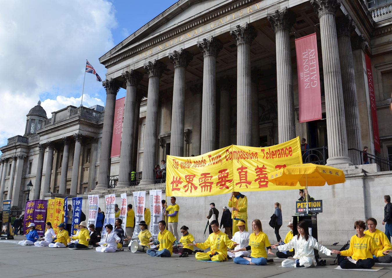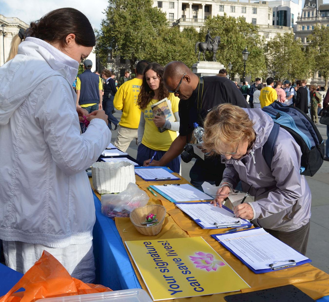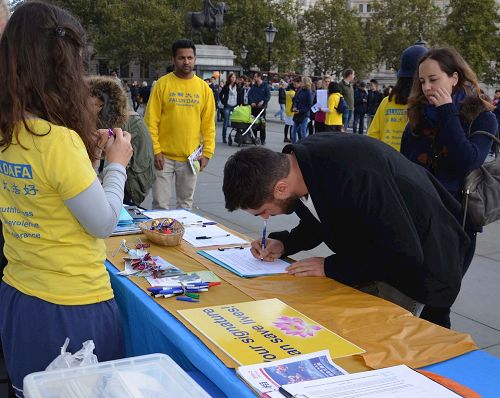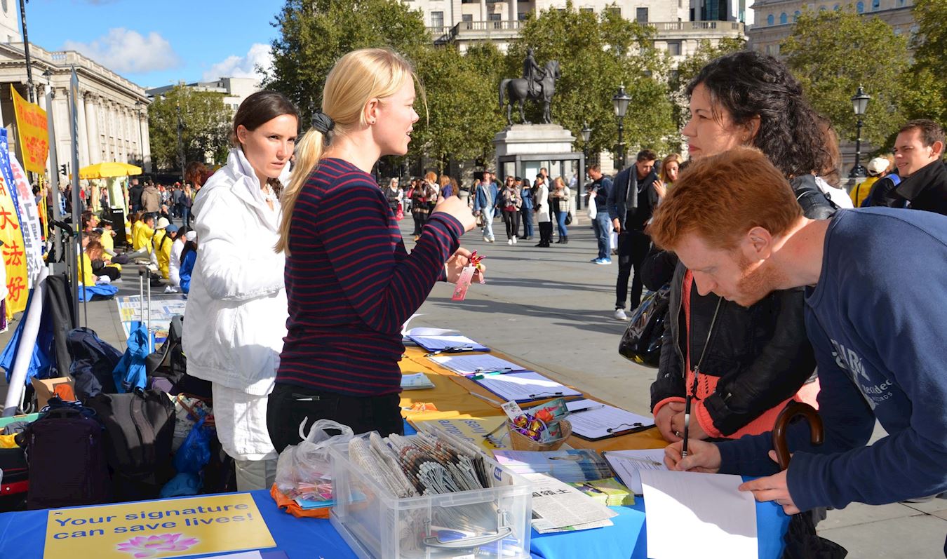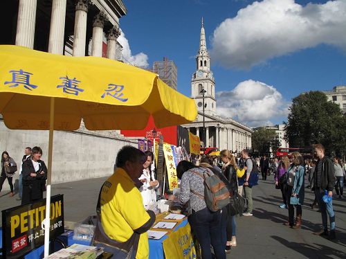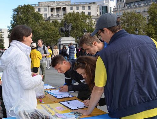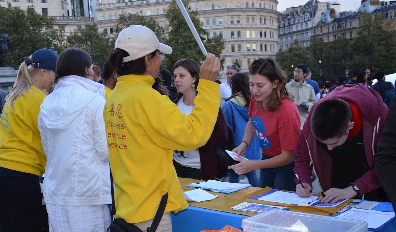 游行结束后,法轮功学员在特拉法加(Trafalgar Square)北平台举行了近五个小时的集体炼功和讲真相活动,并结合DAFOH提议设立的“反强摘国际日(October 1st as International Day Against Forced Organ Harvesting)”活动,重点向民众讲清中共活摘器官的罪行及其背后的中共自一九九九年七月以来残酷迫害法轮功的真相,明白真相的民众纷纷签名反活摘。