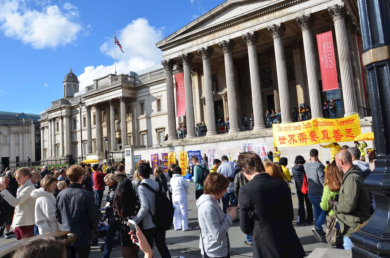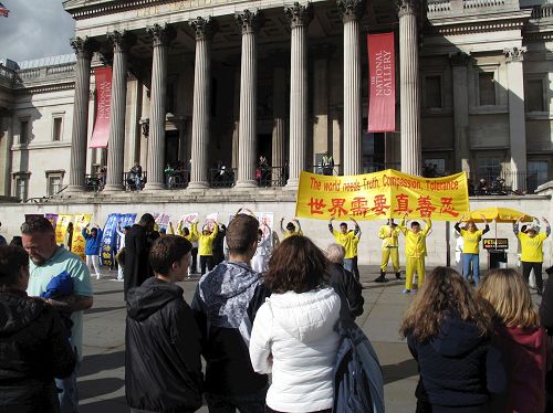 ![]() 图7-9:二零一六年十月一日下午,法轮功学员在特拉法加(Trafalgar Square)北平台举行集体炼功和讲真相活动,吸引众人目光。 |