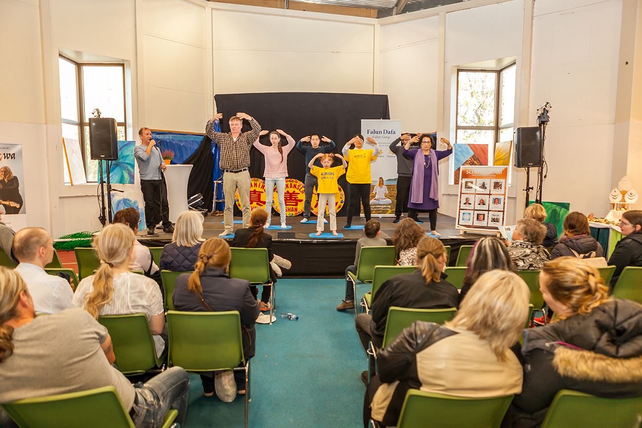法轮功学员与往年一样,不仅设立了展台,还安排了专场演讲,介绍什么是法轮功。由于第一天来听专场介绍的人很多,房间里的座位都坐不下了,主办方在第二天帮忙换了一个大的房间。