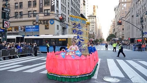 法轮功队伍阵容庞大,多姿多彩。“法轮大法好”,“世界需要真善忍”等中英文大横幅在第五大道上飘扬,鲜艳的服装与旗帜点亮了深秋的曼哈顿,各族裔观众看得目不转睛。