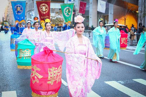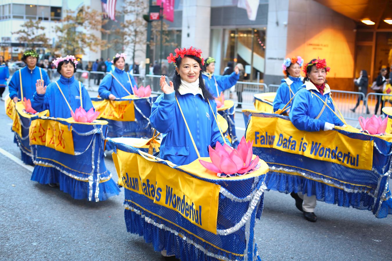 有力的鼓点、整齐的步伐、古色古香的蓝色唐装,壮观的天国乐团一出场,就震撼人心。手提镶有真、善、忍字样大灯笼的身穿淡粉浅黄中国传统汉服的仕女们优雅端庄;赤、橙、黄、绿、青、蓝、紫的彩旗阵,威武气派;空中飘扬的书有“真善忍”的大旗引人注目;写有“法轮大法好”的旱花船色彩明快;炼功队伍整齐地展示着法轮功动功功法;腰鼓声声,喜气洋洋。
