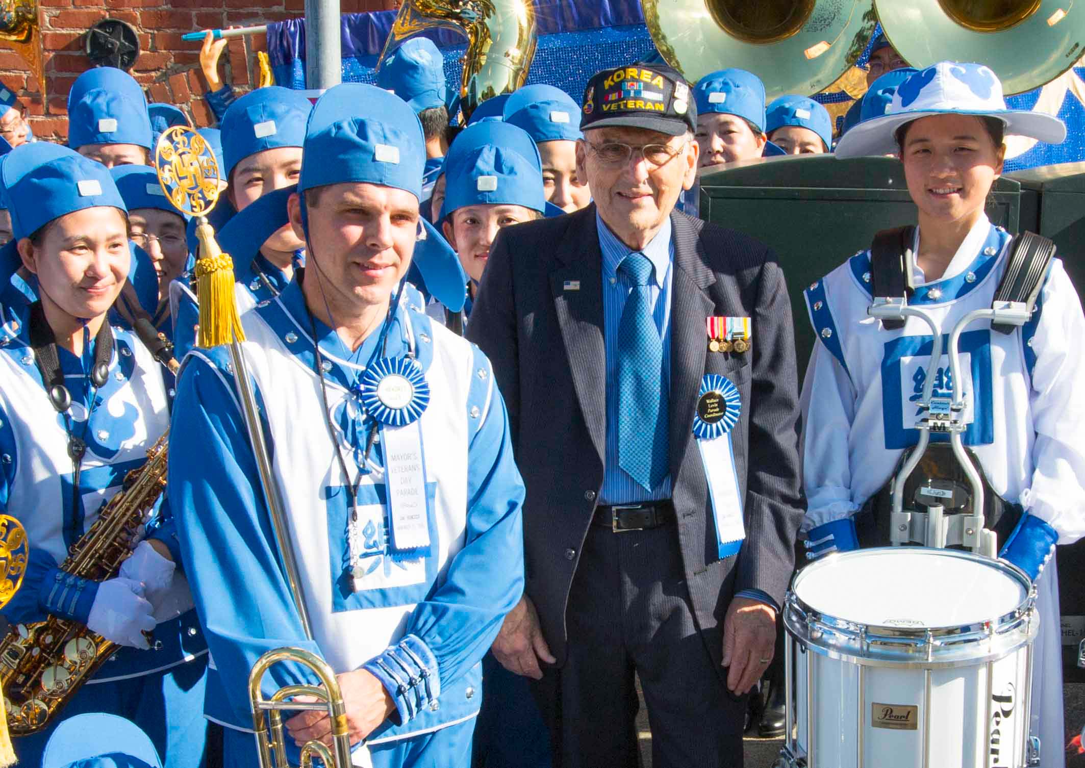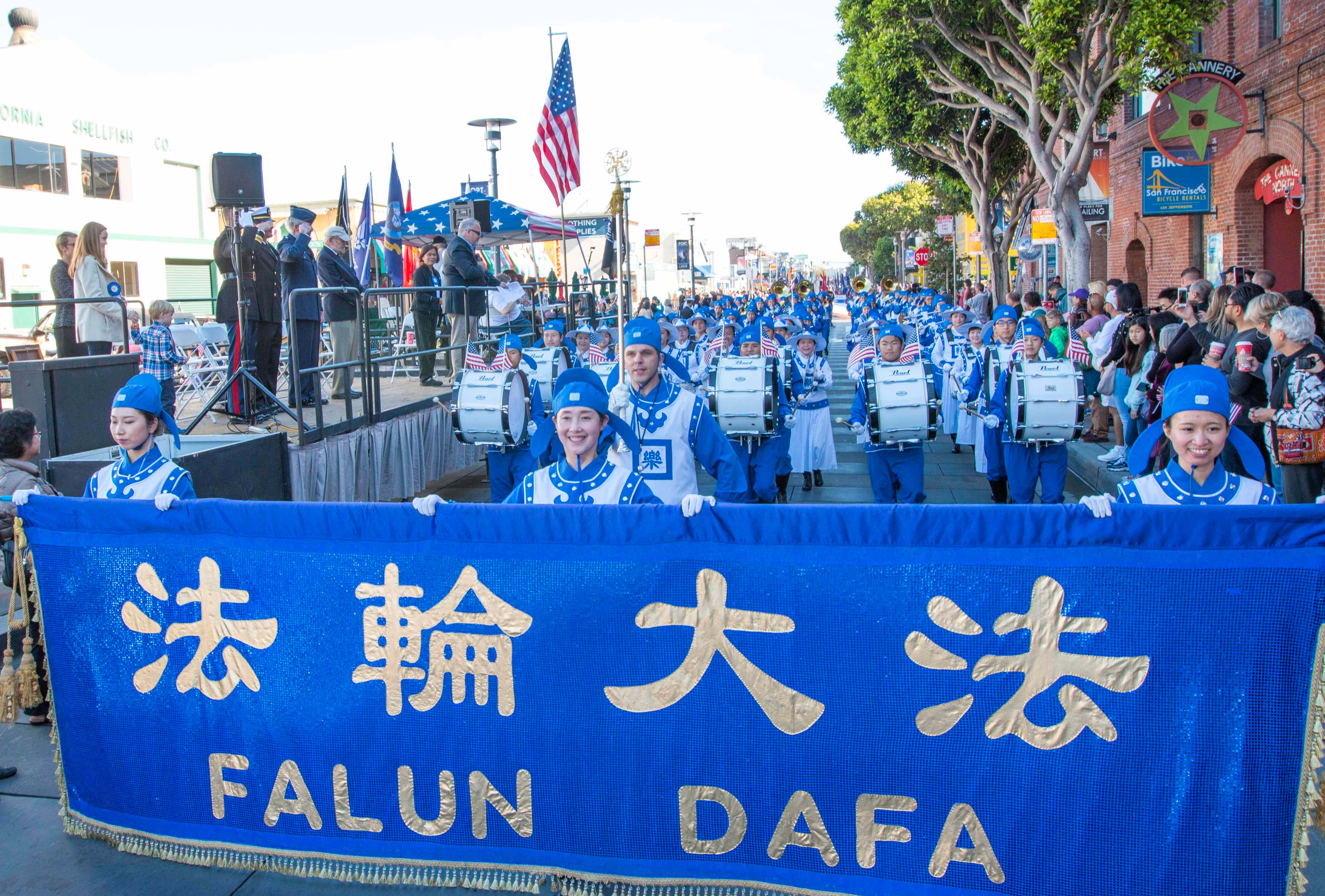 他还说:“天国乐团演奏的音乐非常美,你们不只是100%的棒!你们是1000%的棒!你们应该感到骄傲,为作为天国乐团的成员感到骄傲。你们也要为你们推崇中华文化感到骄傲。”最后他高兴地与乐团成员合影,并再次感谢天国乐团。他说:“希望你们明年再来参加游行。”这是法轮功学员第八次参加旧金山老兵节游行。