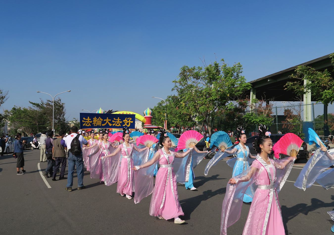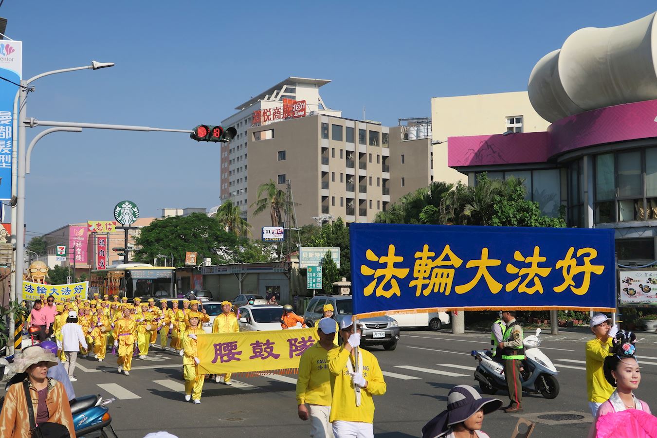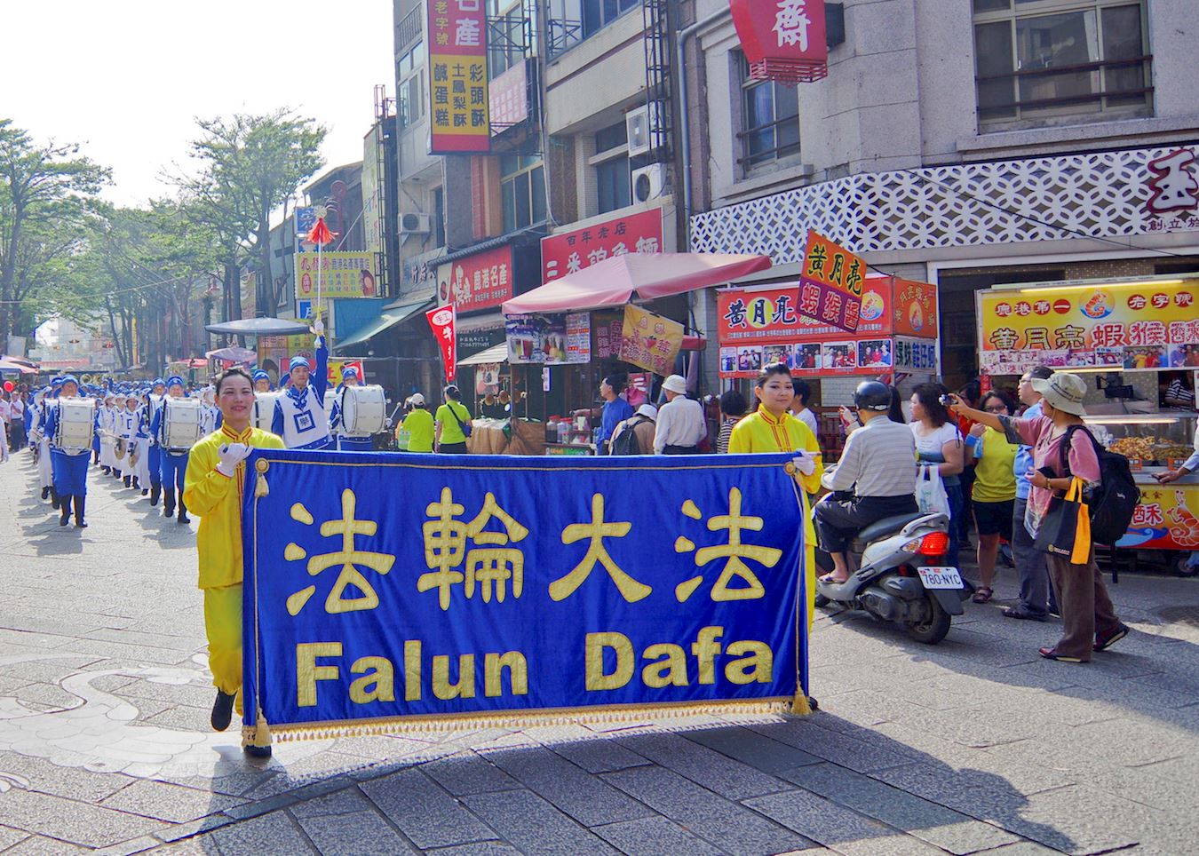 游行队伍行经鹿港镇主要道路,节奏明快的军乐声、鼓乐声响彻街道,民众纷纷从家中出来观看,并给与法轮功的队伍高评价。