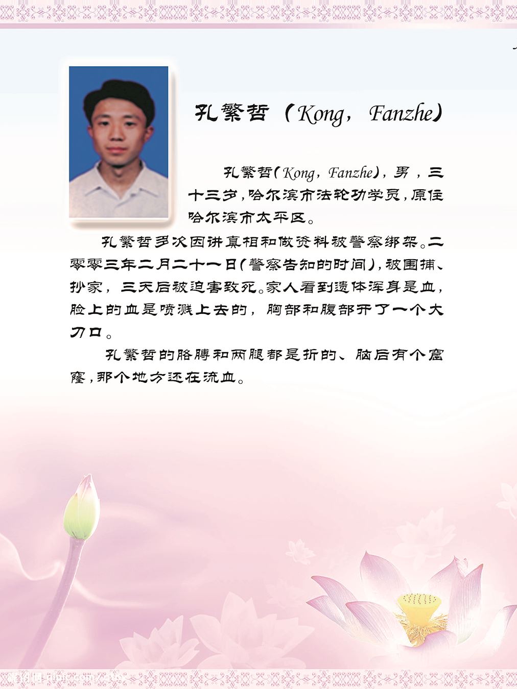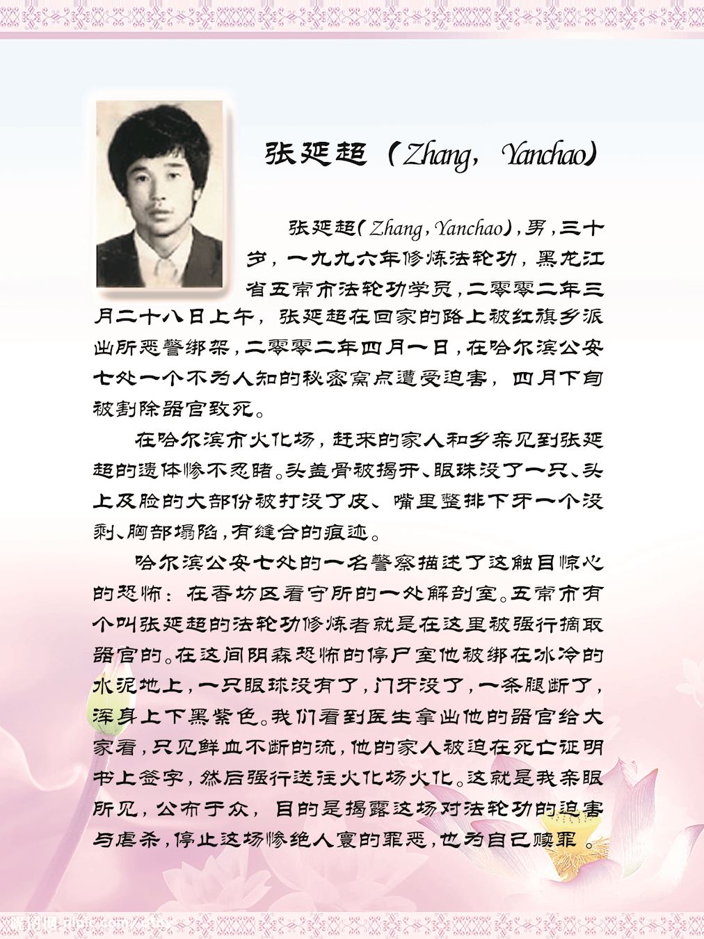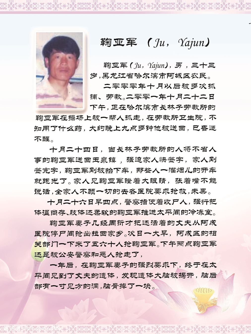 然而,一九九九年七月二十日,以中共头目江泽民为首的一伙邪恶之徒,凌驾国家宪法、法律之上,举倾国之力疯狂迫害手无寸铁信仰“真、善、忍”的法轮功学员。在中共江泽民集团的密令下,齐齐哈尔市610(专门迫害法轮功的非法组织)、公安局对法轮功学员开始跟踪、骚扰、绑架、敲诈勒索、非法关押、非法劳教、非法判刑……等手段来迫害法轮功学员放弃信仰,到今未停止过。