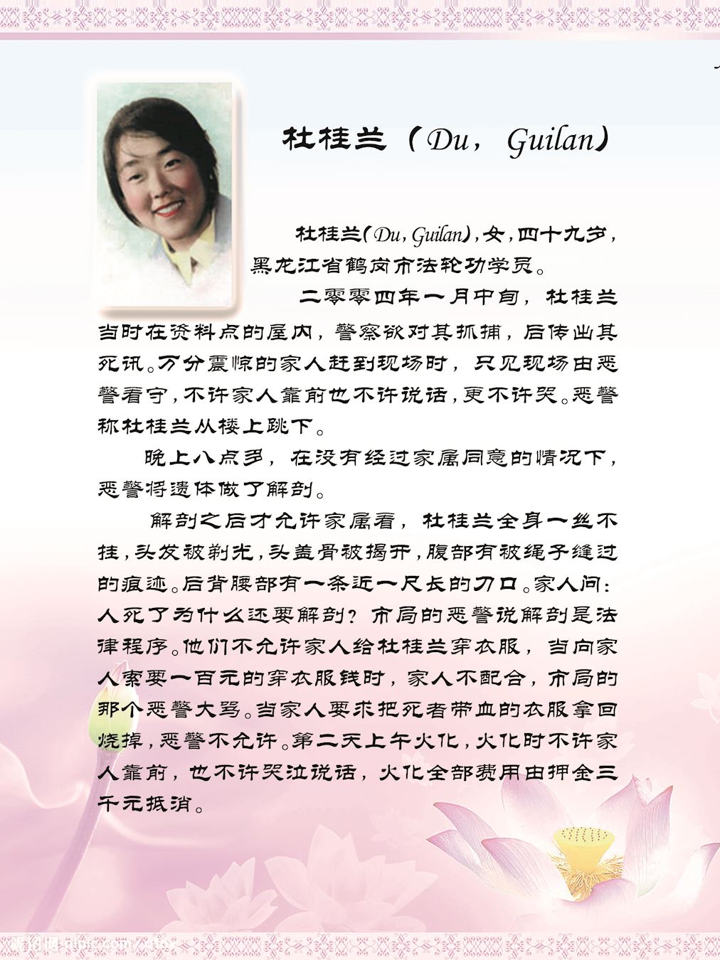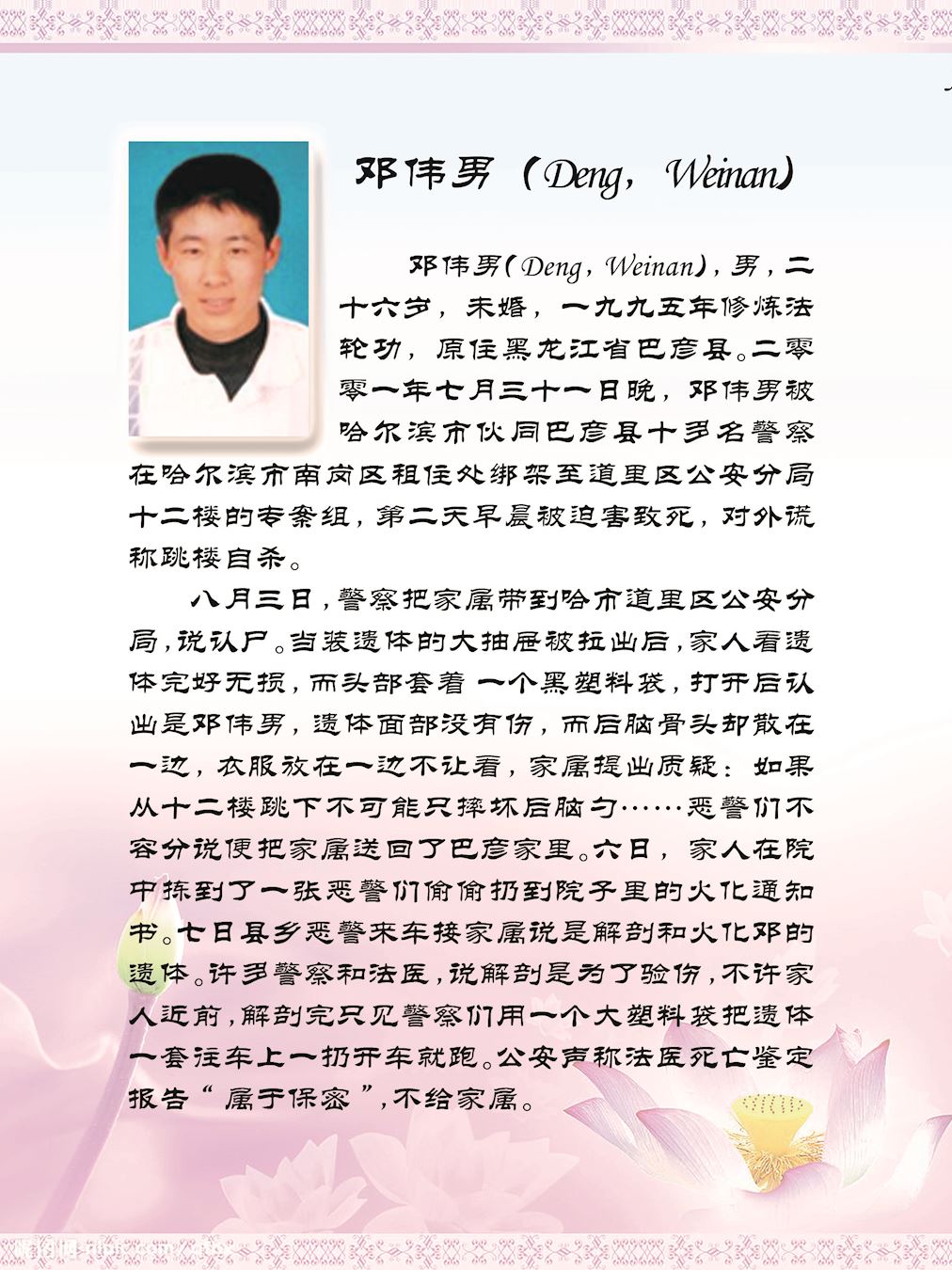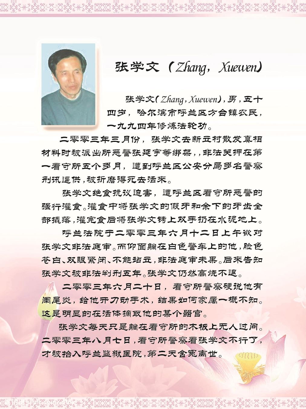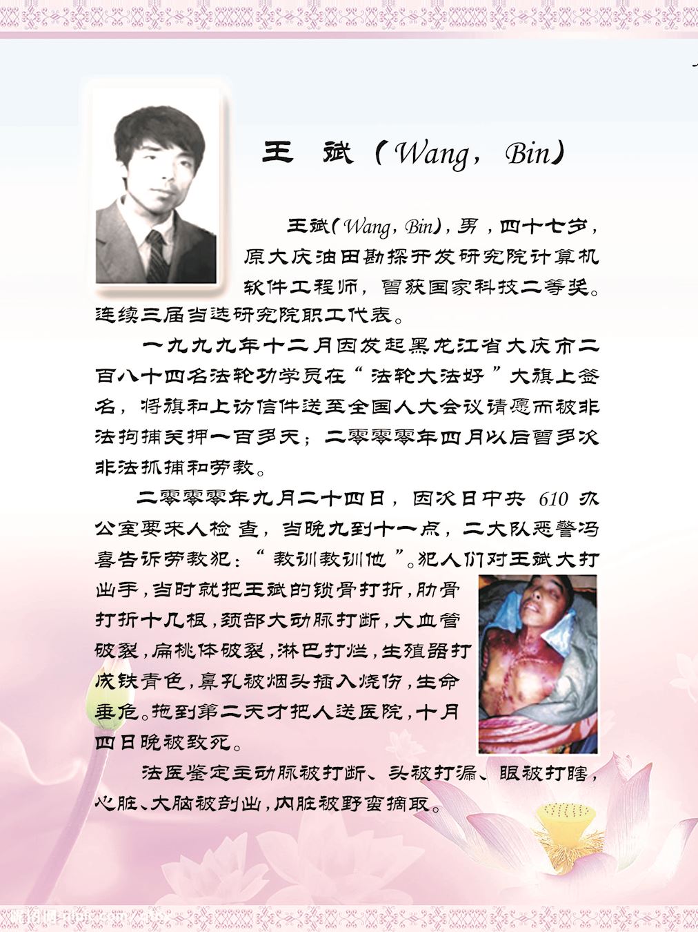 然而,一九九九年七月二十日,以中共头目江泽民为首的一伙邪恶之徒,凌驾国家宪法、法律之上,举倾国之力疯狂迫害手无寸铁信仰“真、善、忍”的法轮功学员。在中共江泽民集团的密令下,齐齐哈尔市610(专门迫害法轮功的非法组织)、公安局对法轮功学员开始跟踪、骚扰、绑架、敲诈勒索、非法关押、非法劳教、非法判刑……等手段来迫害法轮功学员放弃信仰,到今未停止过。
