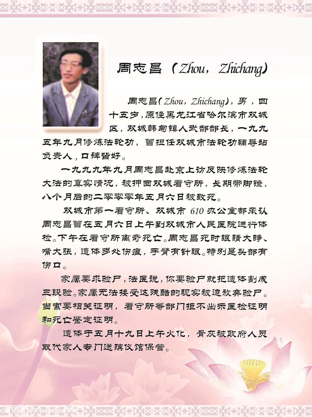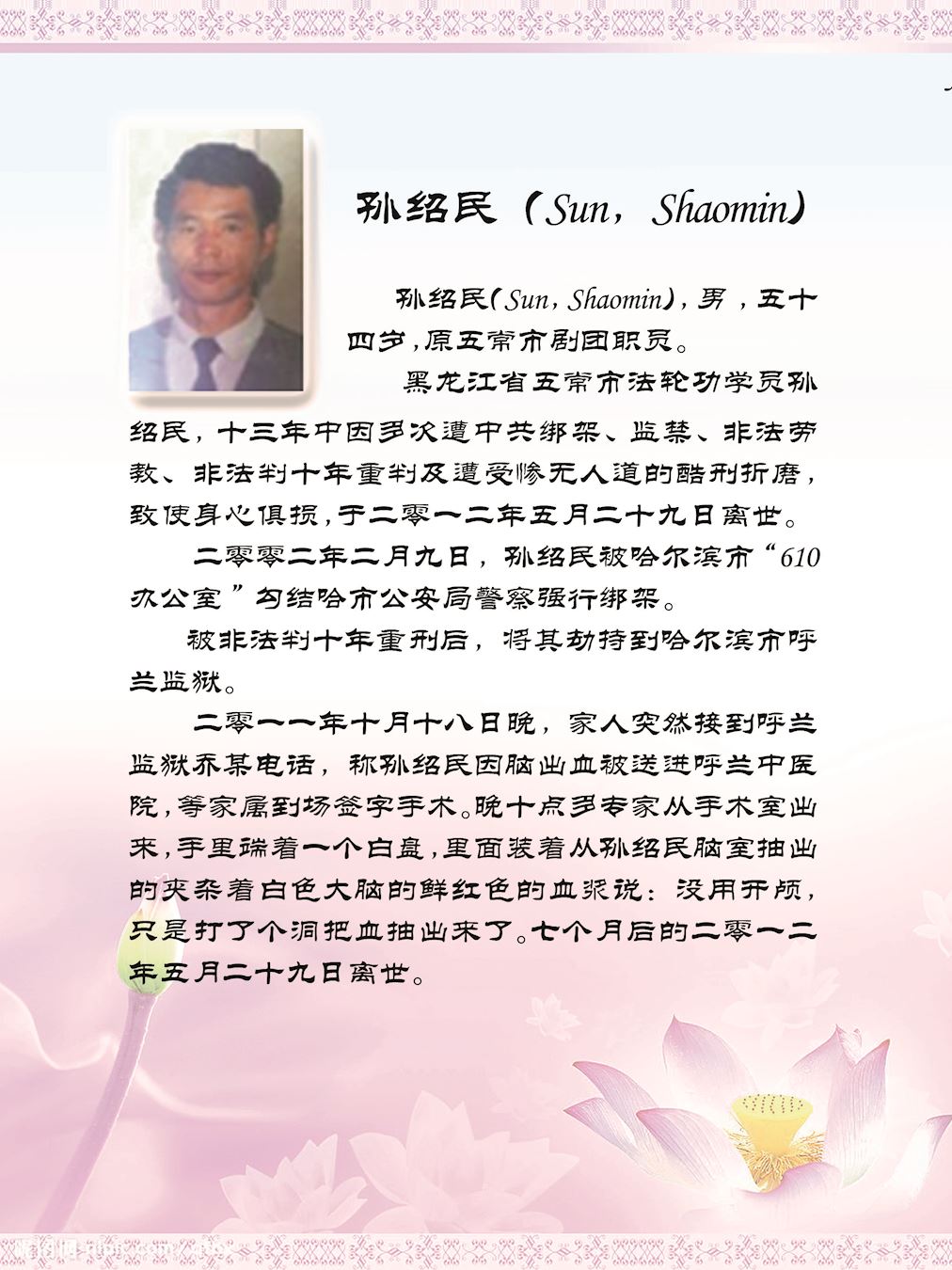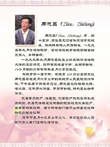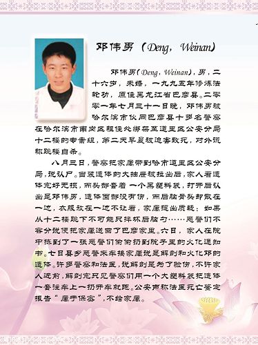 刘晶明(Liu, Jingming)男,就职于齐齐哈尔市中医院,是一名优秀的采购员。二零零七年二月八日被非法送往泰来监狱继续迫害,四十六天后被迫害致死,年仅三十九岁。