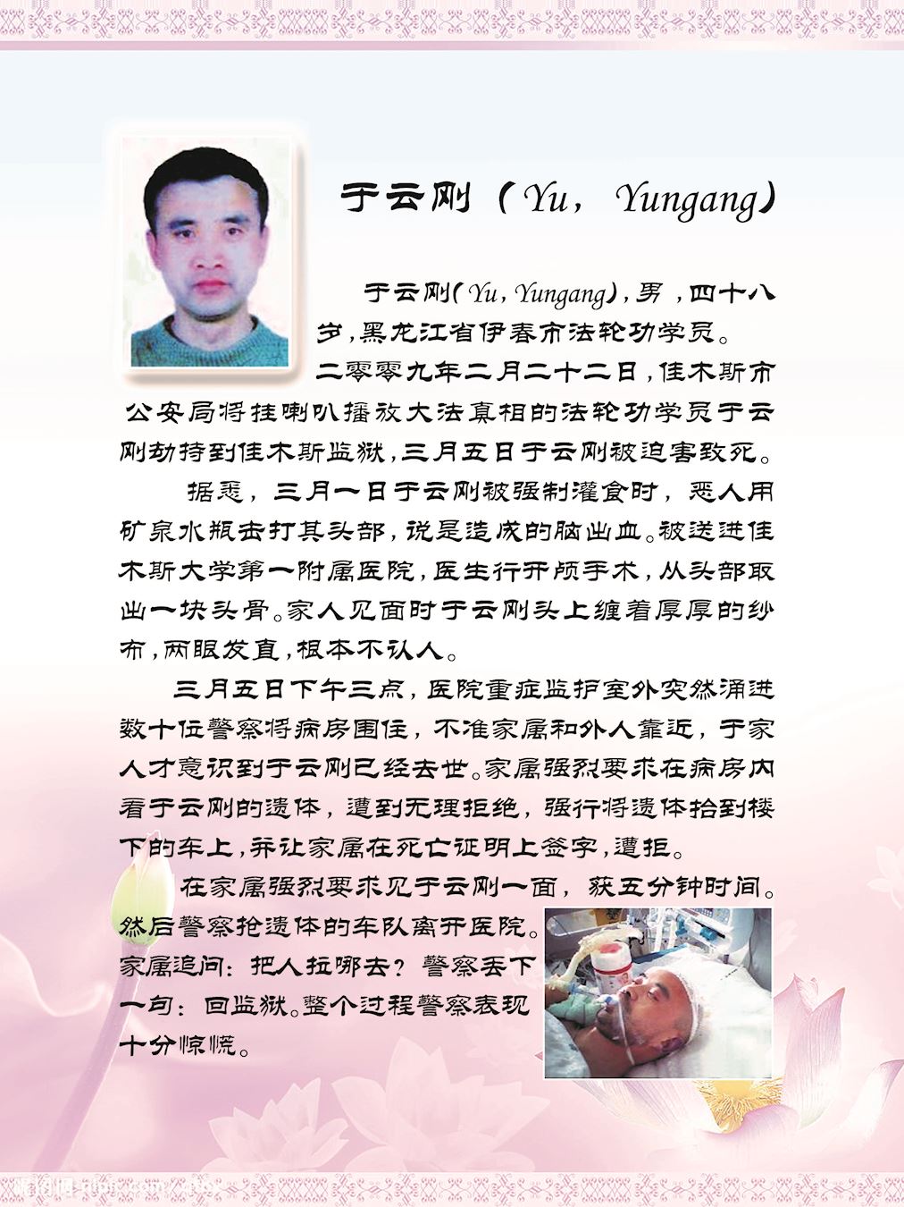 二零一一年七月八日,潘本余在齐齐哈尔市第三医院抢救期间,来了几个公安暗中调查潘本余的病情。后来发现潘本余住院期间的鉴定被改写。七月十七日半夜一点多潘本余停止了呼吸。