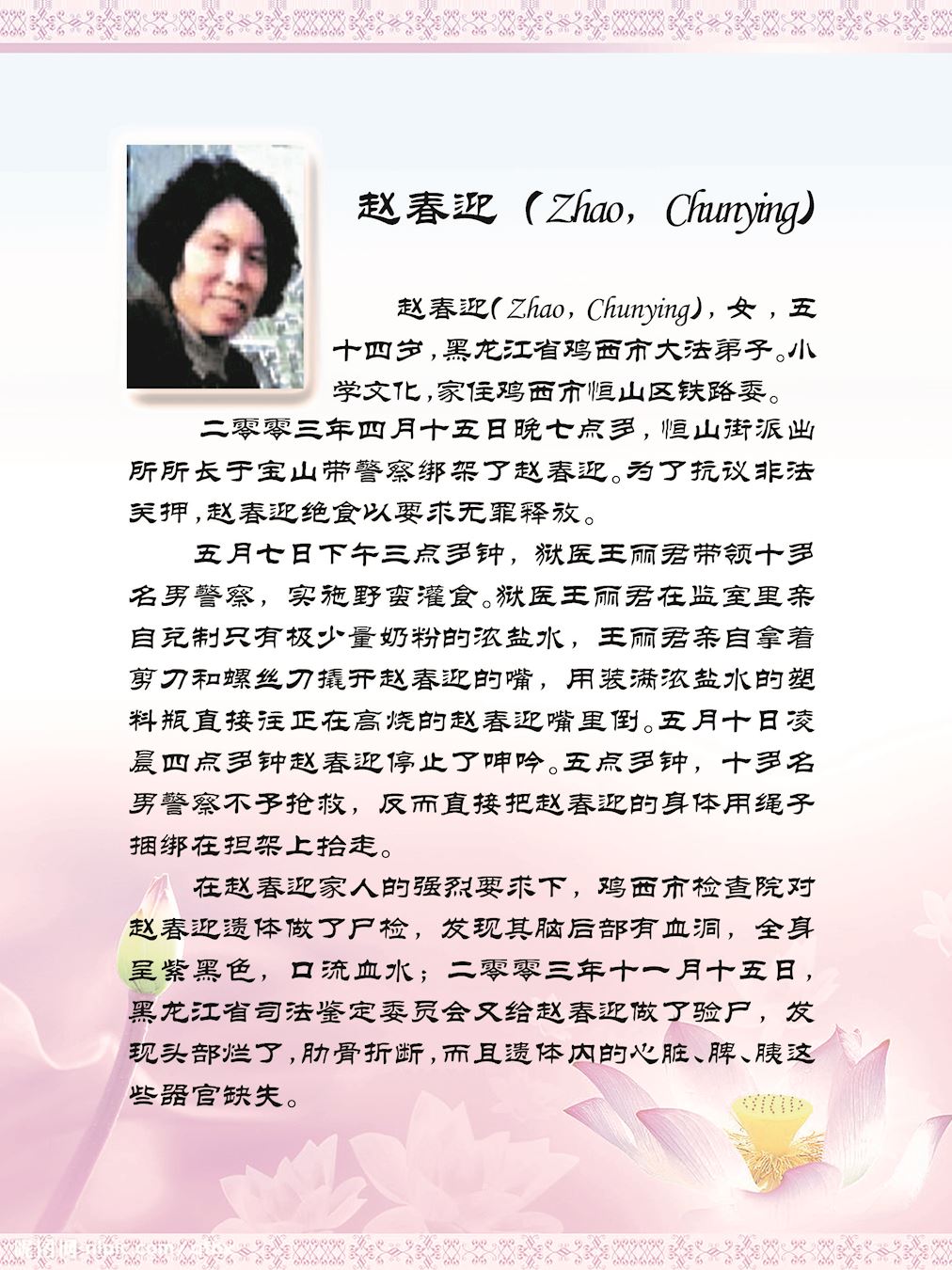 ![]() 图:沈阳法轮功学员 赵秀丽 |