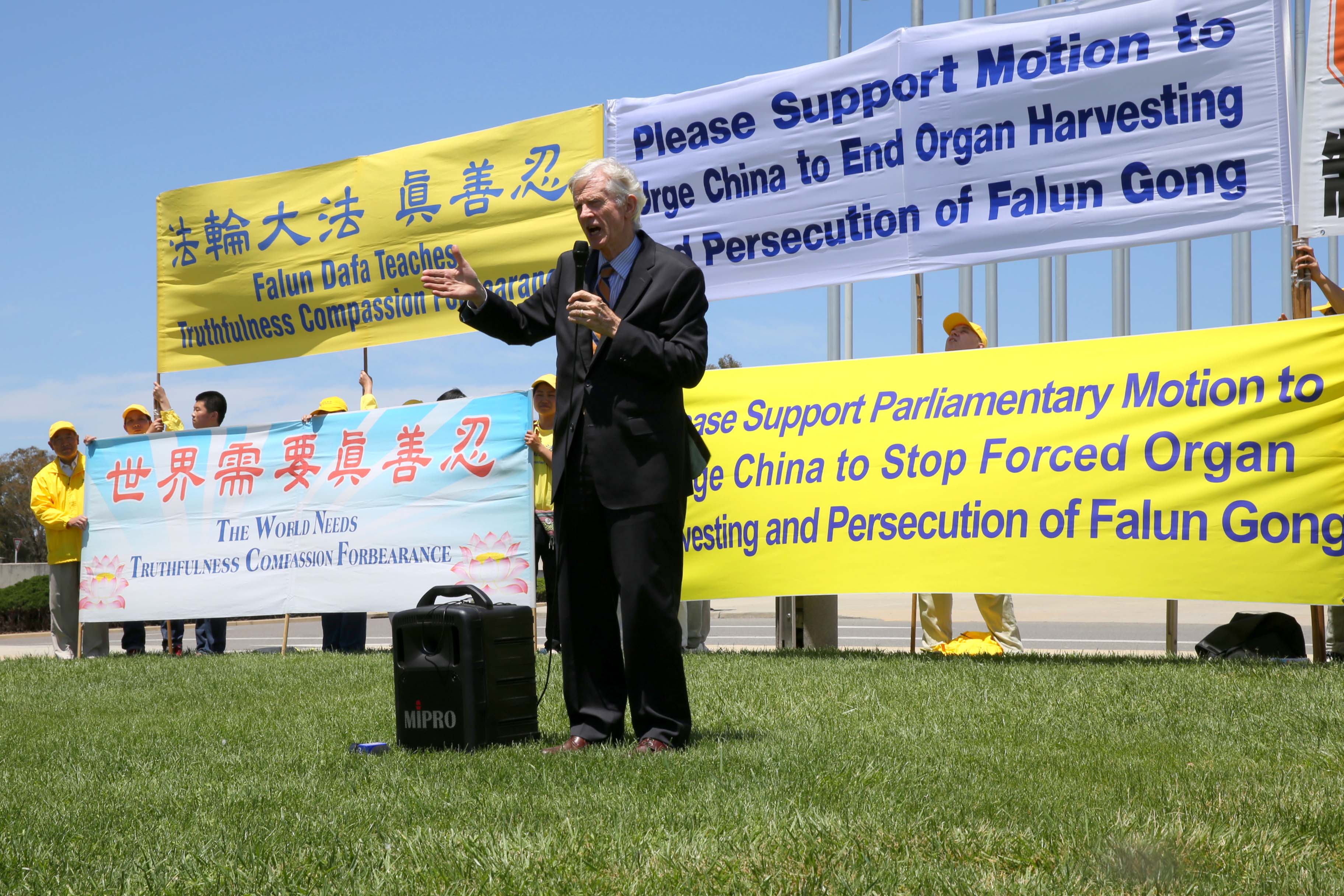 ![]() 加拿大前亚太司司长大卫·乔高(David Kilgour)在集会上发言 |
