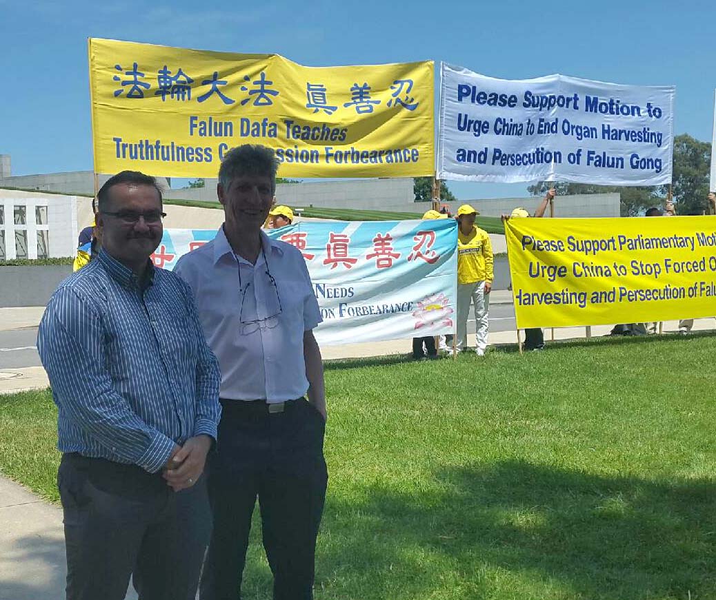 当天中午,在听证会结束不久,部分参加听证会的成员包括澳洲国会议员克雷格·凯利(Craig Kelly)以及来自加拿大的著名人权律师大卫·麦塔斯和加拿大前联邦内阁部长大卫·乔高来到国会外大草坪前与来自澳洲各地法轮功学员和社会各界聚会,进一步敦促澳洲政府通过动议案,制止中共迫害法轮功和强摘器官罪行。