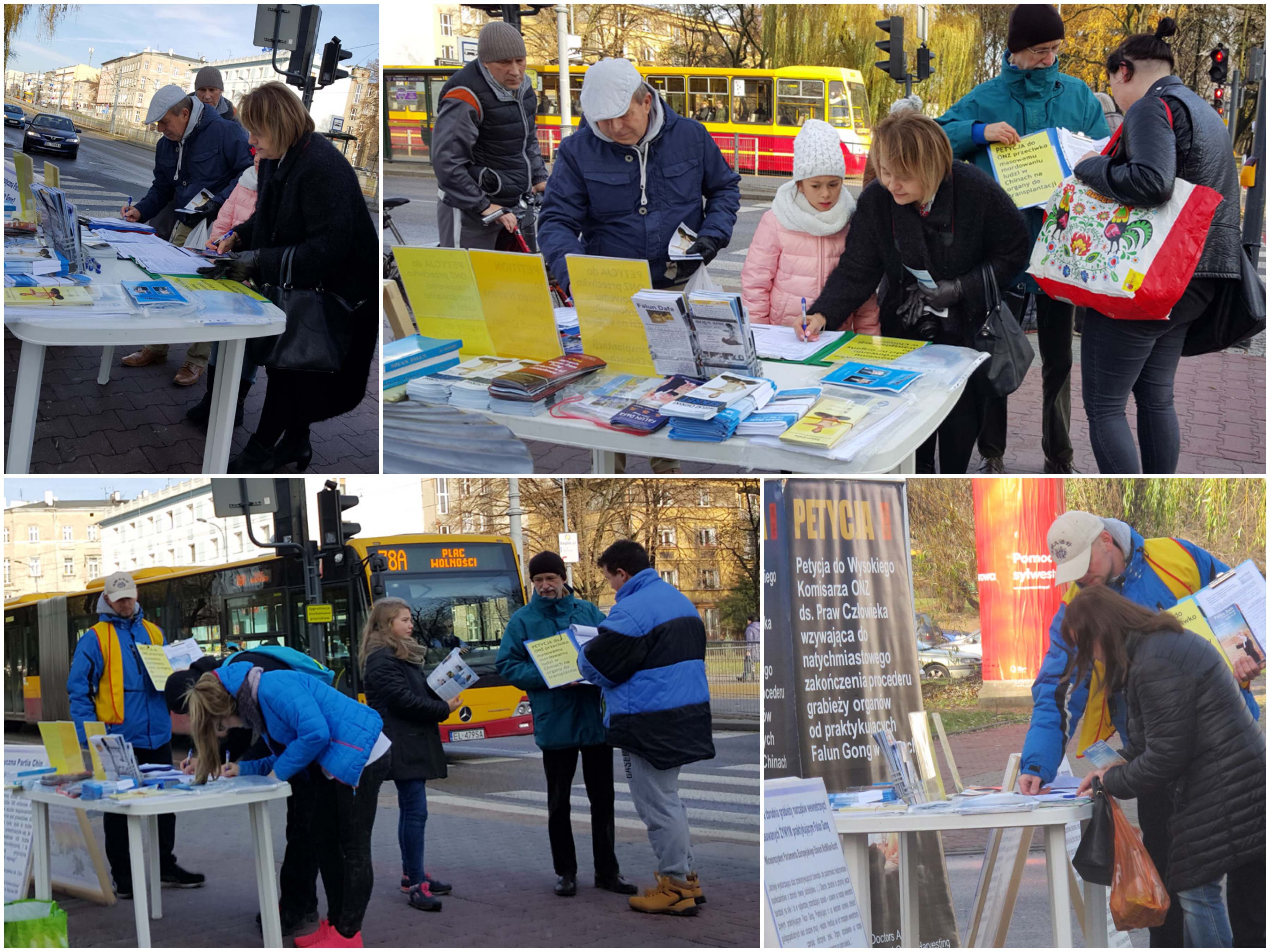 一位波兰中年男士在征签簿上签下自己的名字后,告诉法轮功学员他是学其它气功的,非常喜欢中华文化,他早就知道中共迫害法轮功一事,虽然对法轮功知之甚少,但不能容忍这种邪恶和残暴,他说:我一直都感到好像有更深的另外内涵的东西,但是不知到哪里询问,只炼动作就感到很好了,那个中国共产党难道不知道气功是中国的珍宝,怎么就容不下好东西?!”法轮功学员告诉他:“共产党的本质就是反人类的,从来不会改变,推荐阅读《·九·评*共产党》,如果是关于气功问题,请阅读《转法轮》,这本书已让上亿人走入修炼之路,您的问题这本书都会解答。”“真的吗?太好了。”这位先生马上购买了一本《转法轮》,站在那里开始翻看目录,最后他请求留下罗兹法轮功炼功点地址、时间和罗兹法轮功学员的电话,希望保持联系。