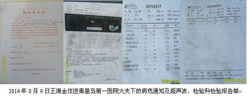 经过两天的多项检查,说最后通过心脏彩超确诊为全心衰竭,正常人的心衰指标小于250,而王海金的心衰指标已超过9000多,心脏比正常人的心脏增大一倍多,不能正常收缩了,随时都有生命危险。秦皇岛市第一医院主治大夫说王海金身体劳累过度,而且极度缺乏营养;住院治疗仅仅是维持缓解费用已是很高,如果想进一步治疗,几万几十万甚至更高的费用是无法确定的,而且病情到如此地步已无法预见后果,即使住院也随时都有生命危险,于是医生下了病危通知要家属签字。亲友都知道王海金由于修炼法轮功后身体非常健康,从来不打针吃药,就这么健康的身体现在被迫害的生命垂危,家人亲友如雷轰顶不敢面对眼前的事实。