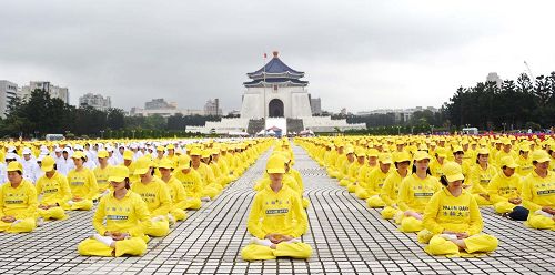 ![]() 图5-6:六千多名法轮功学员在台湾台北自由广场集体炼功。 |