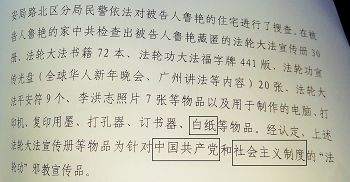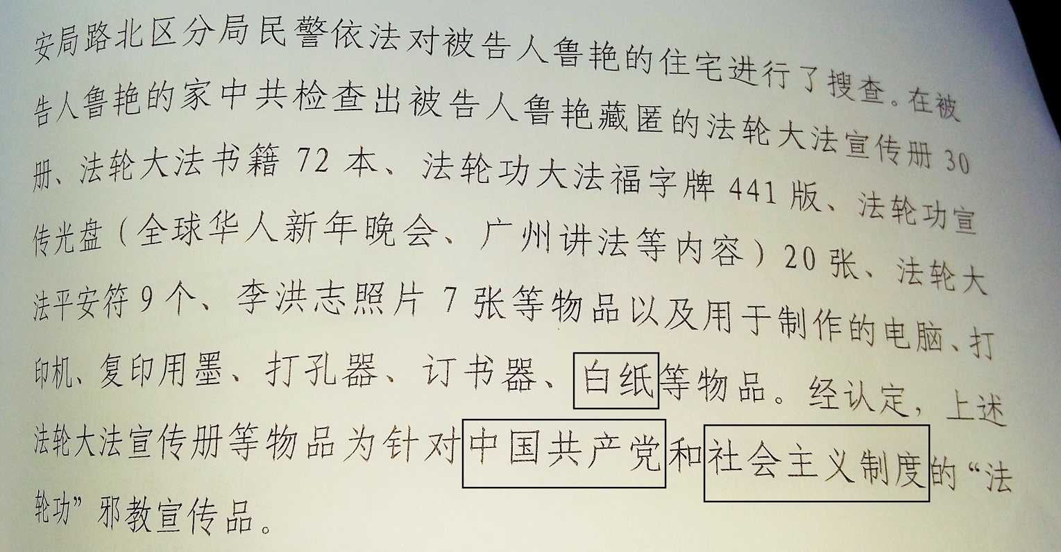 唐山市路北区检察院对鲁艳的所谓起诉书称“经确定,上述法轮大法宣传册等物品为针对中国共产党和社会主义制度的”,泄露了一个从来不敢明言的秘密:这个党和这个制度不让人按照“真、善、忍”做好人,不让人了解真相。