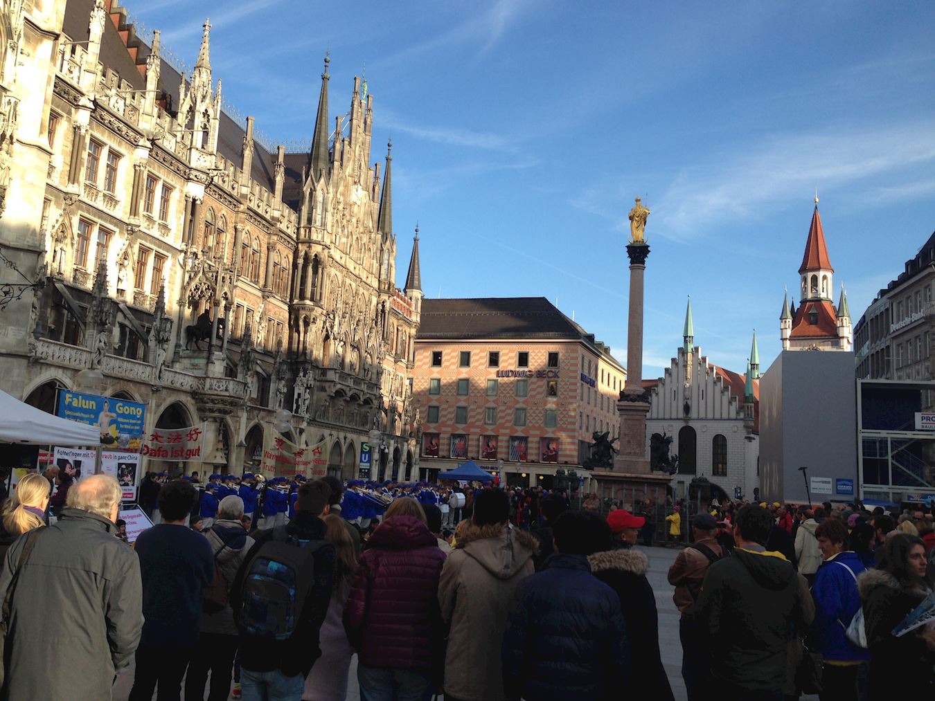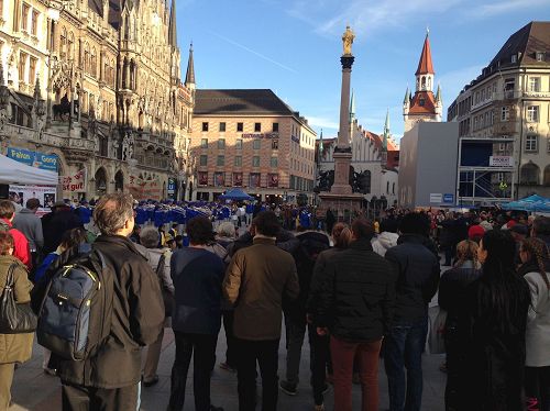 【明慧网二零一六年十一月六日】(明慧记者唐秀明德国慕尼黑采访报道)二零一六年十一月四日,来自欧洲各地的逾千名法轮功学员,在德国慕尼黑市中心著名的玛利安广场(Marienplatz)举行集体炼功和集会,向广大民众和游客讲述法轮功真相,揭露中共迫害法轮功及活体摘取法轮功学员器官的罪恶,呼吁制止迫害。