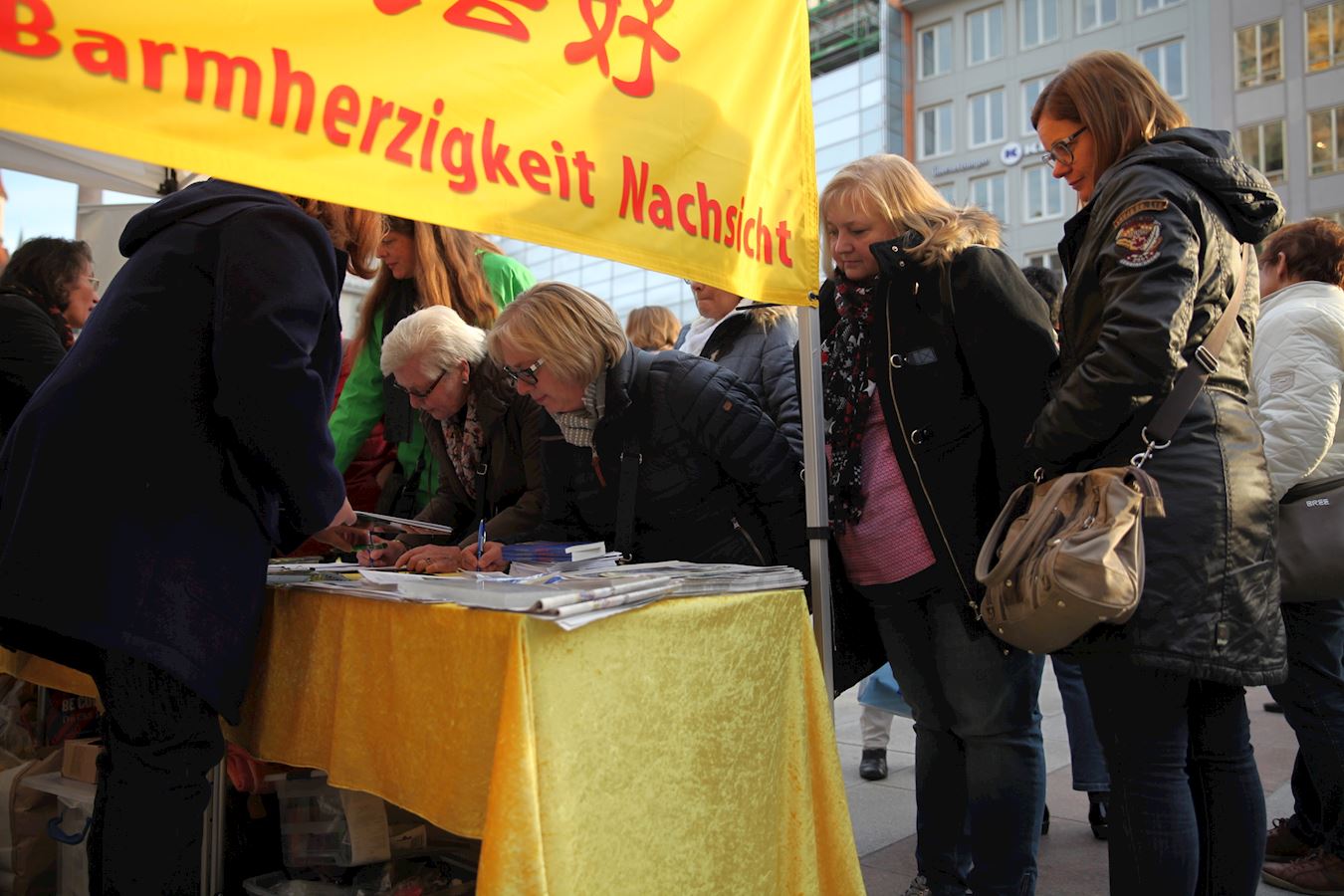 法轮功学员搭起了两个巨大的展板,上面用图片和德文、英文给出的真相信息非常醒目:“法轮功,性命双修的古老修炼方法”、“(法轮功学员)为信仰遭受酷刑,(中共)为暴利活摘器官”、“请签名帮助制止在中国发生的活摘法轮功学员器官(反人类暴行)”。