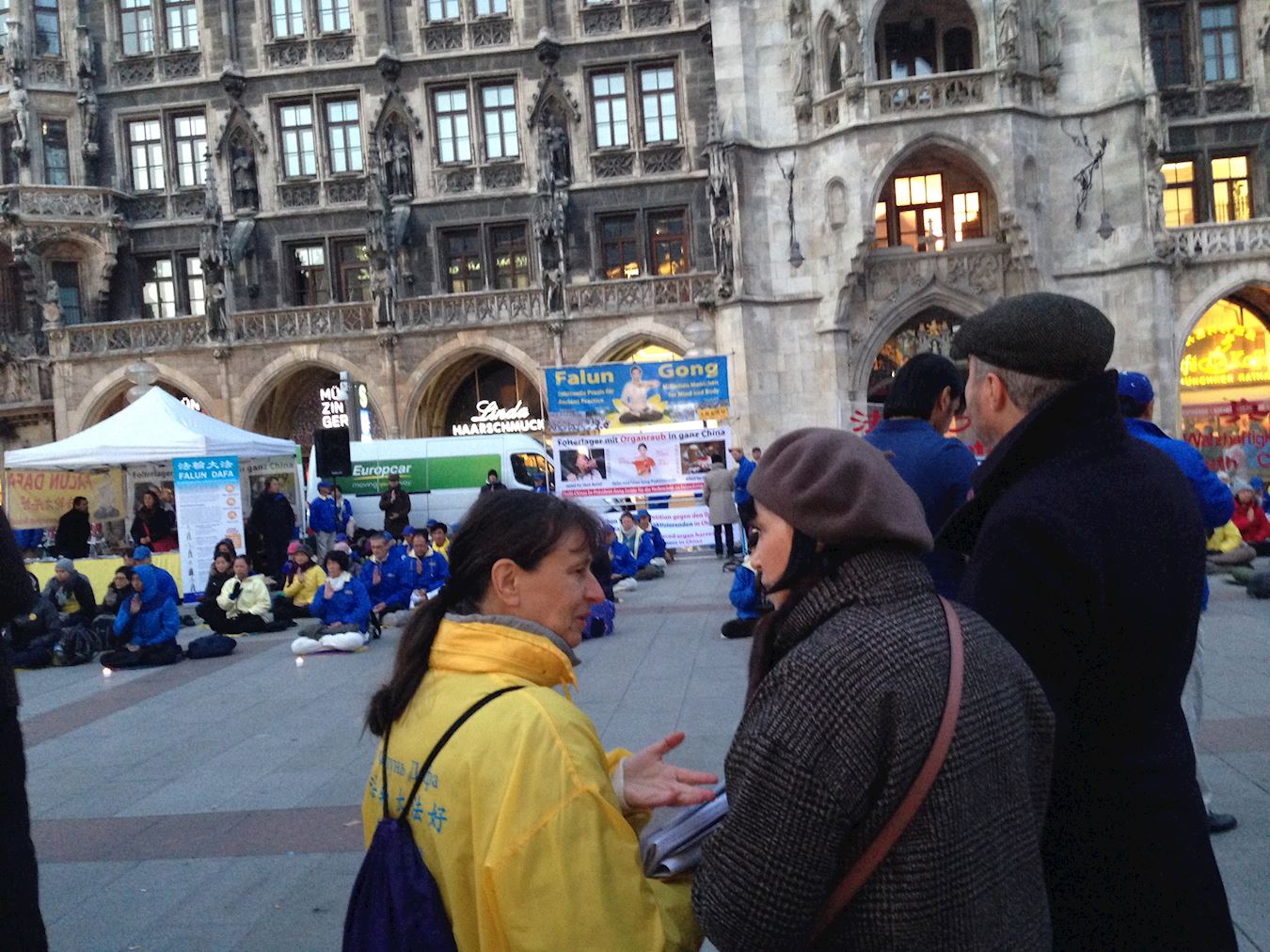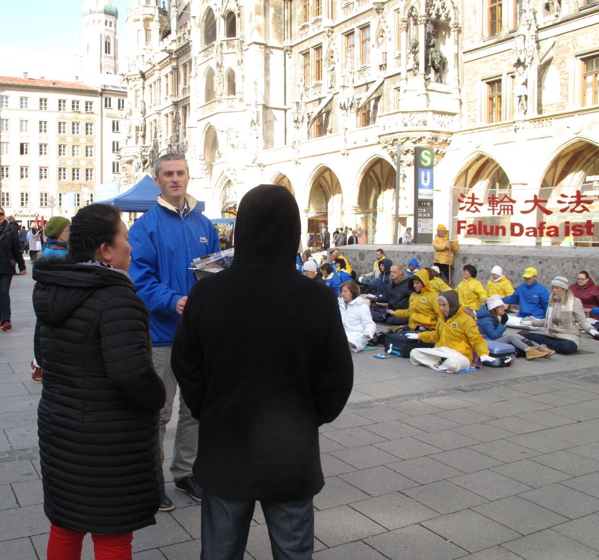 玛利安广场是慕尼黑老城区的心脏,至今保有慕尼黑市的中心地位,是慕尼黑新、旧市政厅所在地,也是游客必到的地方。法轮功学员当天的活动让这个著名的广场成为传播法轮功真相的大舞台,从早晨十点到晚上八点,法轮功学员以多种形式传递的真相信息遍布整个广场。与平日熙熙攘攘的人流、喧闹嘈杂的人群不同,人们今天在这里感受到法轮大法的美好、法轮大法“真善忍”修炼者的平和能量,更被中共的邪恶罪行所震惊。