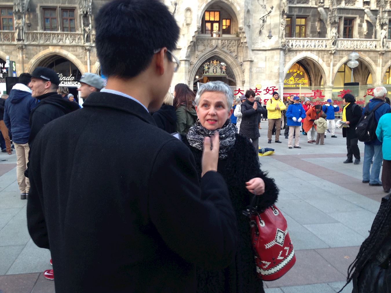 苏珊女士是位住在慕尼黑的时装设计师,她在集会现场驻足聆听,听到一位法轮功学员在向站在她身边的一位路人揭示对中共大规模活摘法轮功学员器官的罪行指证,她开始向那位路人