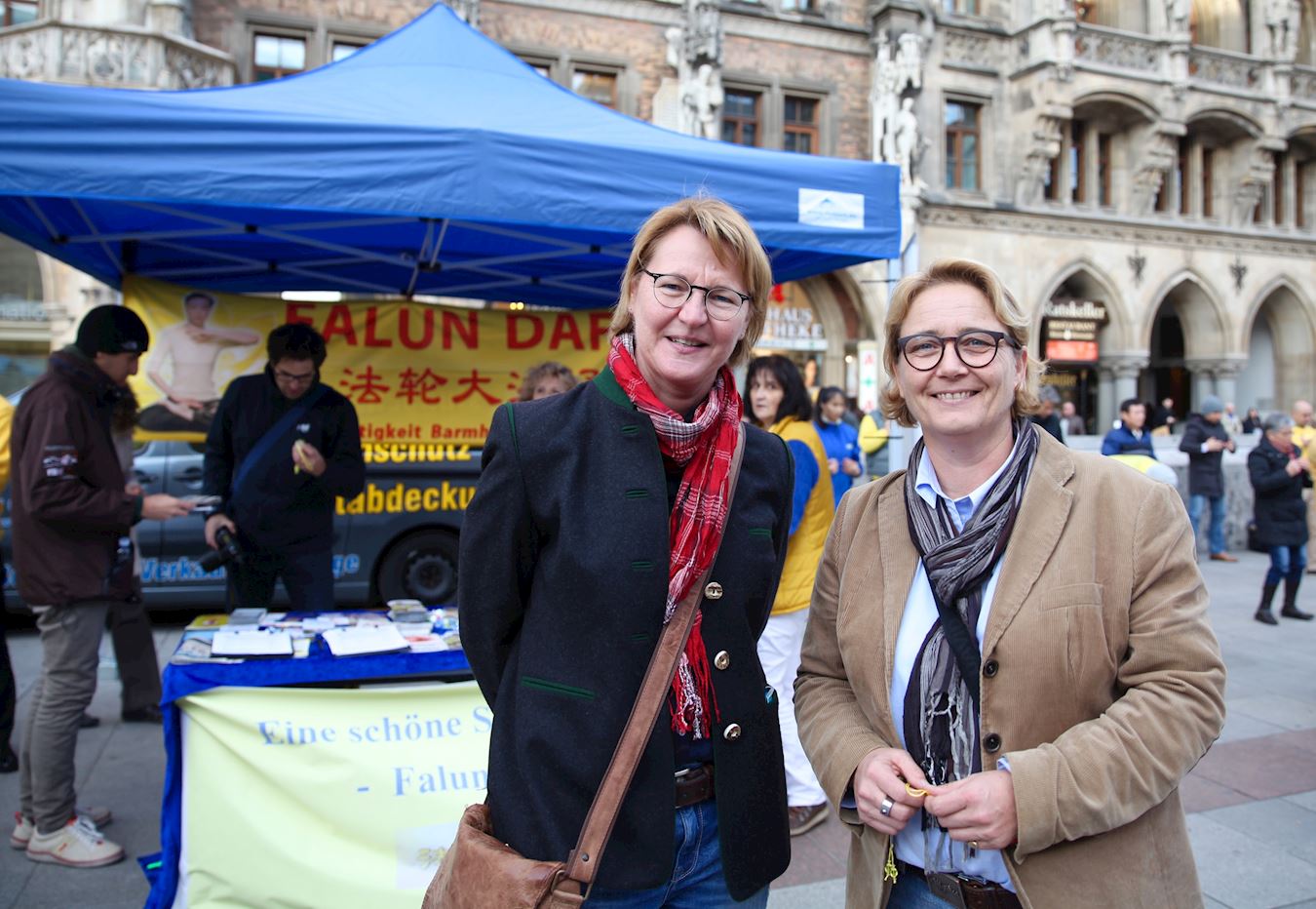 '图14:女教师Palme(左)和护士Sonnleiter在慕尼黑玛琳广场签名声援法轮功学员反迫害。'