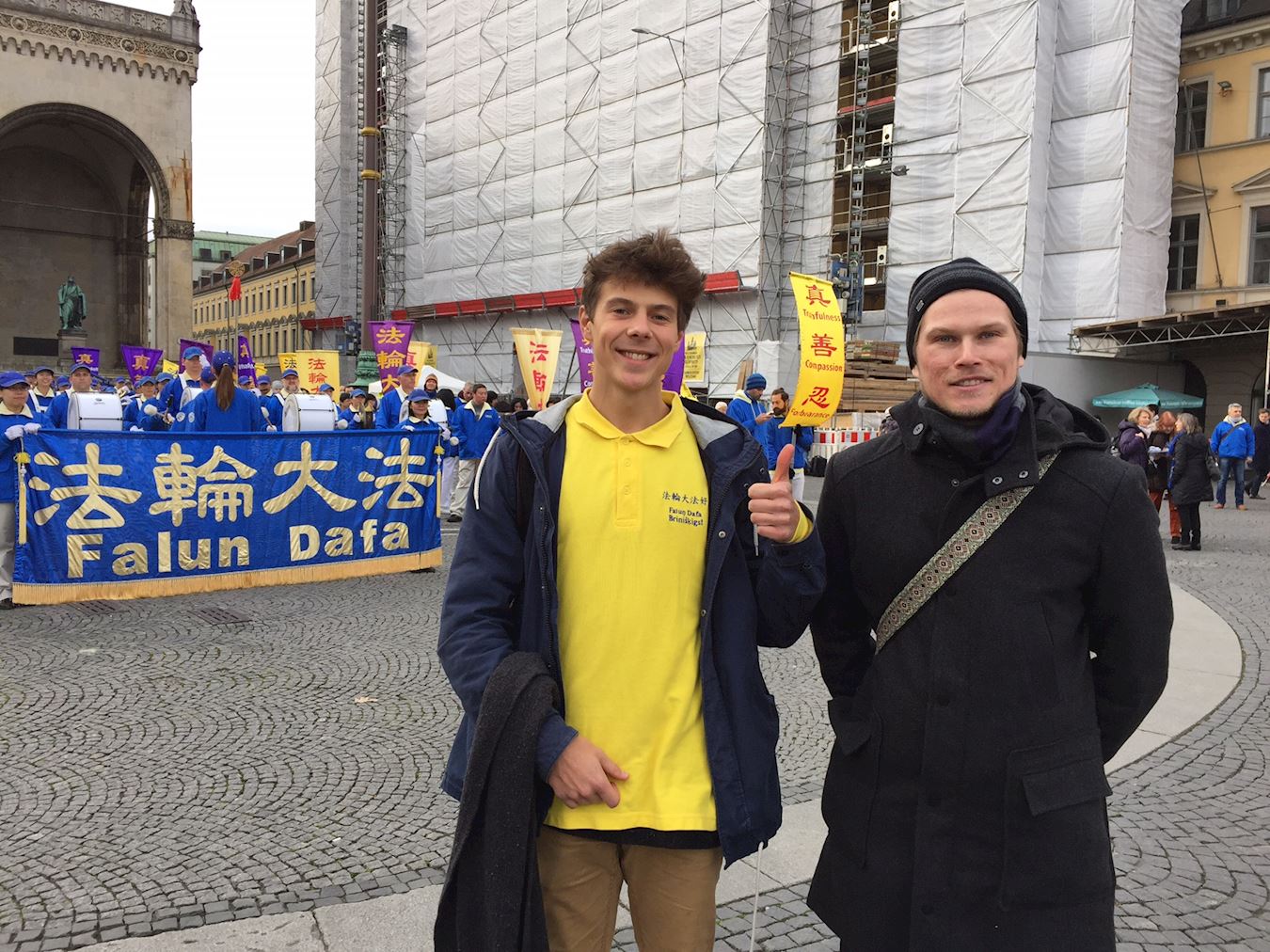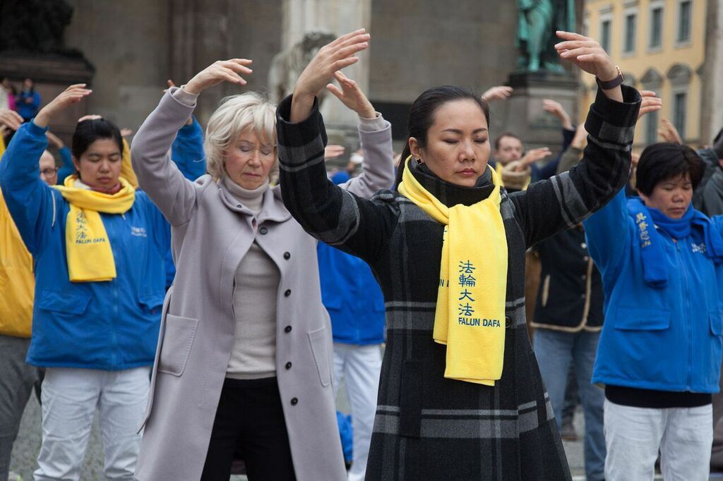 一位德国妇人静静地站在炼功队伍侧前方神情专注地观看,当她转过头接受采访时,刚刚开口,眼睛里已经充满了泪水。她解释说自己很感动,“我的泪水都流下来了。”得知法轮功是佛家信仰时,她面露欣慰地说:“我也是修佛的。”她住在山里,到慕尼黑度假六个月,她说:“我第一次听说法轮功,真善忍的法则很好,非常认同;我有了传单的信息,希望能够更多地了解法轮大法。”得知发生在中国针对法轮功的迫害时,她表示能够想象,因为发生在共产党统治下的迫害对即使西德人来说,也一点都不陌生。她说自由是每个人的权利,不应该也不能够被剥夺。