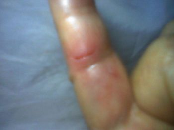 那时,我根本看不到他们谁在干什么,听到居委会的陈女士说:“还是不要把她弄坏了的好。”接着他们用我家里盘里的水果刀(我准备给他们削苹果用的),割伤了我的右手小指,只听副所长命令:“挤呀,使劲挤呀。”