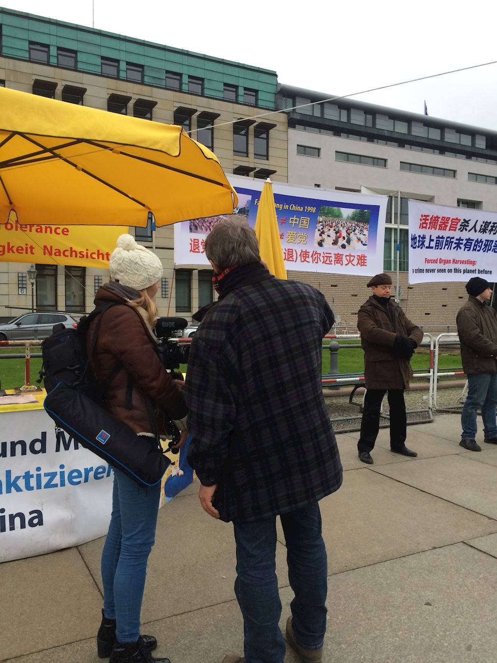 柏林的地标建筑勃兰登堡门前,法轮功学员炼功的场景吸引了很多人的注意。来自波兰的独立制片人娜塔莉亚(Natalia)生活在柏林,她在法轮功信息台前详细了解了中国发生的迫害情况,她说,这是第一次听说法轮功修炼者在中国受迫害,感到非常震惊。她采访了信息台前的法轮功学员,她表示会把这部份内容放入她的影片中。