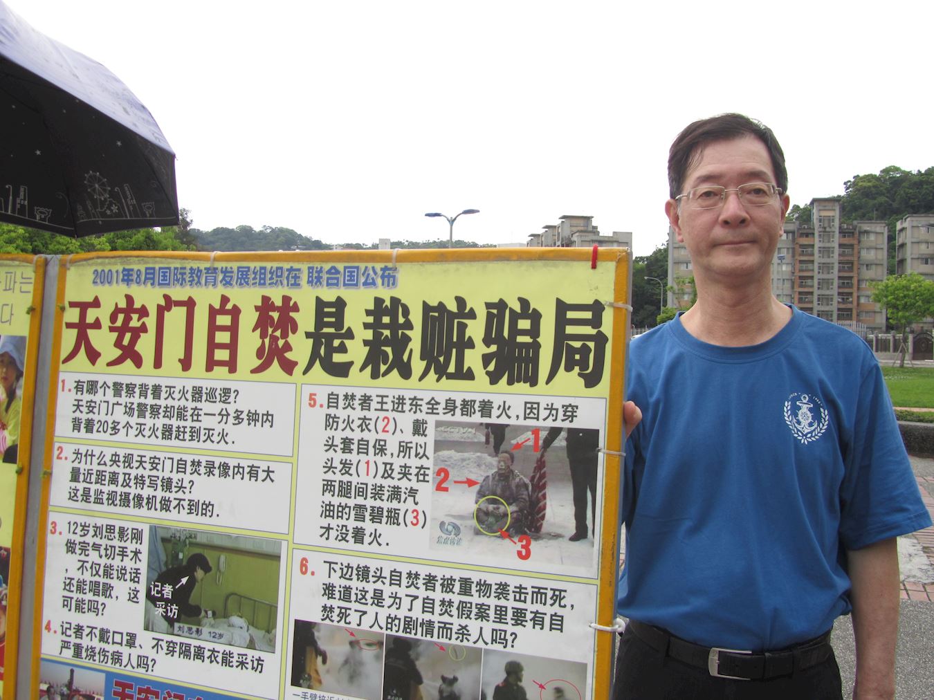 ![]() 图:董国强打从出生不久就因羸弱体质医药不离身,修炼法轮大法之后有了翻天覆地的崭新人生。他每星期固定几天到景点讲法轮功真相。 |