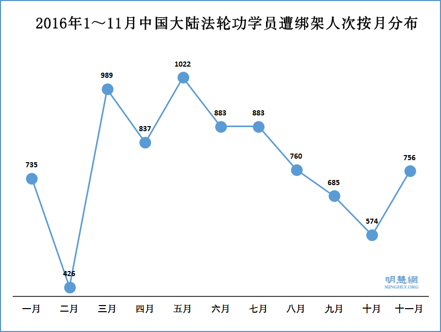 ![]() 2016年1~11月中国大陆法轮功学员遭绑架人次按月分布 |