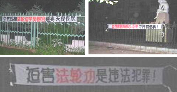 二零零七年七月二十一日,齐齐哈尔市火车站附近街头出现的真相标语:“法轮功反迫害不屈意志光照天地;信仰无罪,停止迫害法轮功;世界需要真善忍,不要中共假恶暴;中共活摘法轮功学员器官贩卖,天良丧尽!”等真相标语。