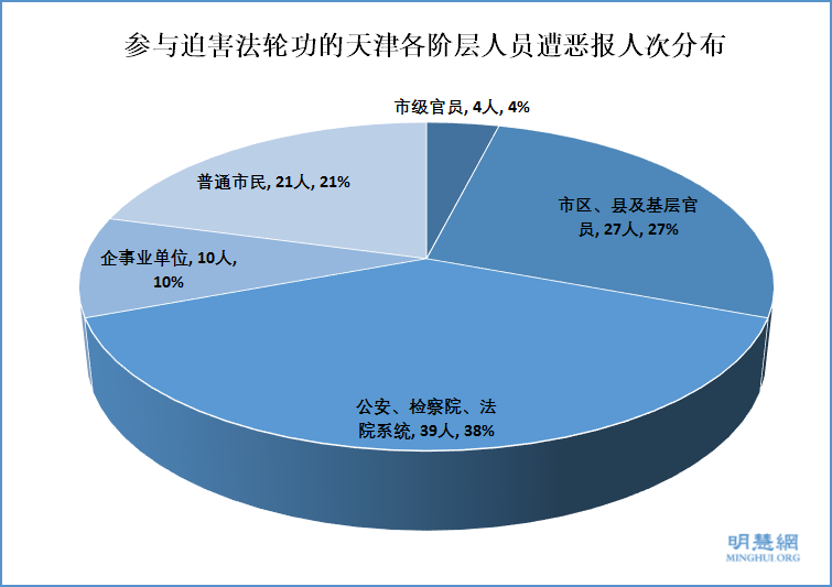 由于各级政府的隐瞒及种种原因,我们整理的恶报实例还是很有限,实际的人数可能还有很多。上面的统计图是根据我们整理出的101个恶报案例做出的,从市级官员到普通百姓,恶报如影随形,其中在这场迫害中作为主要迫害执行者的公检法司人员和地方基层官员遭恶报的比例最高,分别为39%和27%。即使是这些有限的实例,也足以使那些今天还在参与迫害法轮功的人警醒了!否则,恶报随时会降临头上。