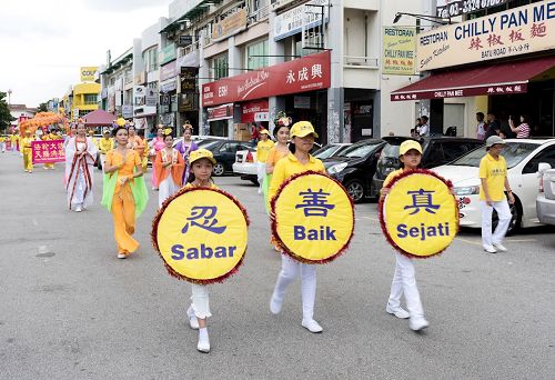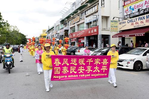 中午十二时许,部份法轮功学员来到巴生武吉丁宜商业区(Bukit Tinggi)游行。天国乐团、仙女队、舞龙队、腰鼓队,还有祥和的法轮功功法示范队伍,在自愿警卫队协助开路下浩荡出发,许多民众喜见法轮功游行,更有民众为法轮功送上祝福。