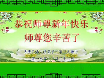 【明慧网二零一六年十二月二十九日】新年到,黑龙江哈尔滨市双城区大法弟子家人和亲属给法轮功创始人李洪志师父发来录音贺词,感恩师父!祝师父新年快乐!他们在录音中表示,感谢大法给了家人和自己健康的身体,感谢师父为全家带来幸福生活!希望对大法的这场邪恶迫害早日结束,盼望师父早日回国,使更多的中国人在大法中受益!