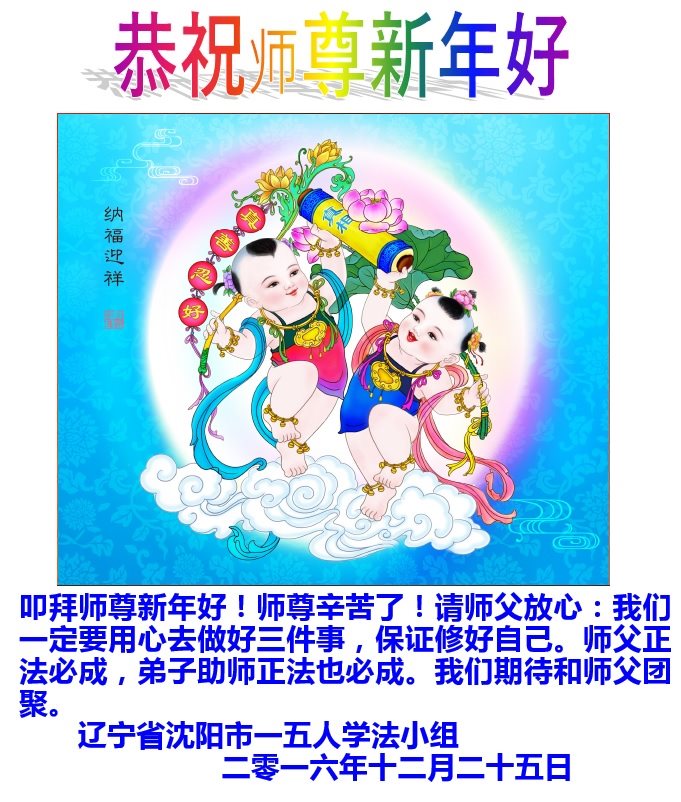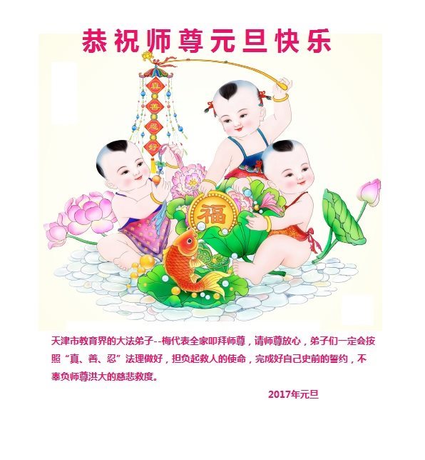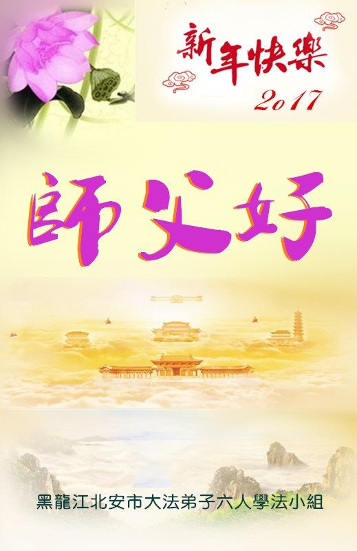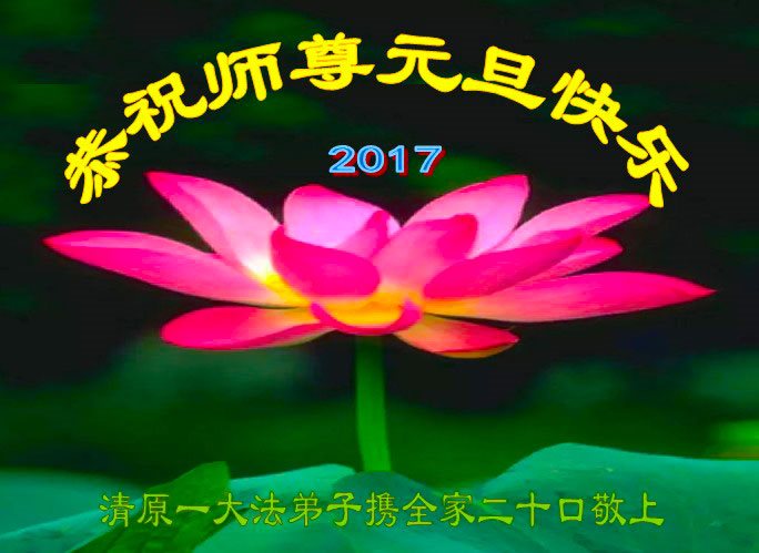 最最尊敬的师尊,我们全家以最崇敬的心情在2017新年到来之际,敬祝您新年快乐!没有师父的呵护就没有我们全家的幸福。全家人身体健康,早期有身体不适时,问他是去医院还是信大法,他(她)们坚定的说信大法,然后化验或拍片啥事没有。两个孙辈女孩从小就沐浴在大法的洪恩中,背《洪吟》,贴粘贴。