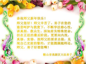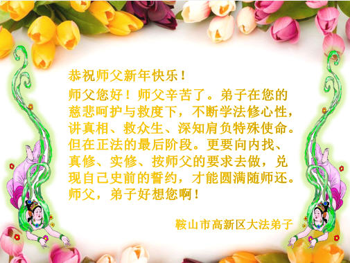 尊敬的师父您好!您辛苦了!您给予弟子太多太多,弟子无以回报,愧对师父,今年入冬以来,师父连续发表了几篇经文,每一篇经文弟子都认真拜读,都是对弟子的鞭策,“棒喝”我一定按师尊的《提醒》做好大法弟子应该做好的三件大事,保证每天的修炼,救度更多的众生,回到美好的家园。跪拜恩师!祝师尊元旦快乐!