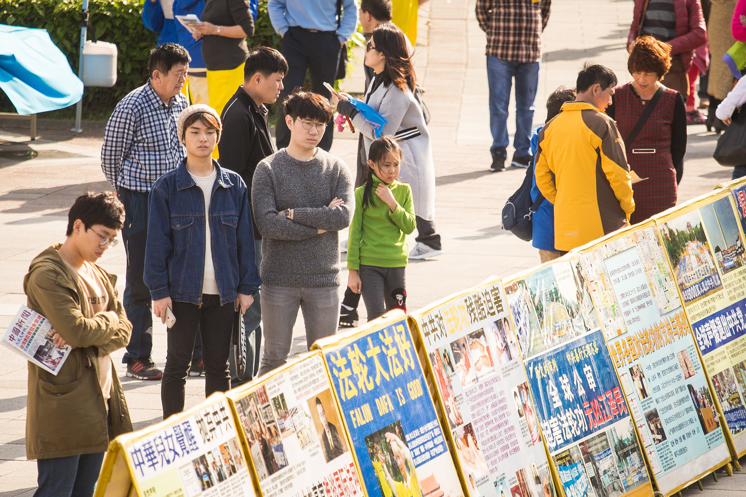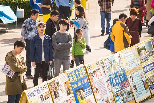 ![]() 图5-6:与此同时,学员们在活动现场摆放了真相展板,吸引众多民众与国外游客、尤其是中国大陆游客驻足观看。 |