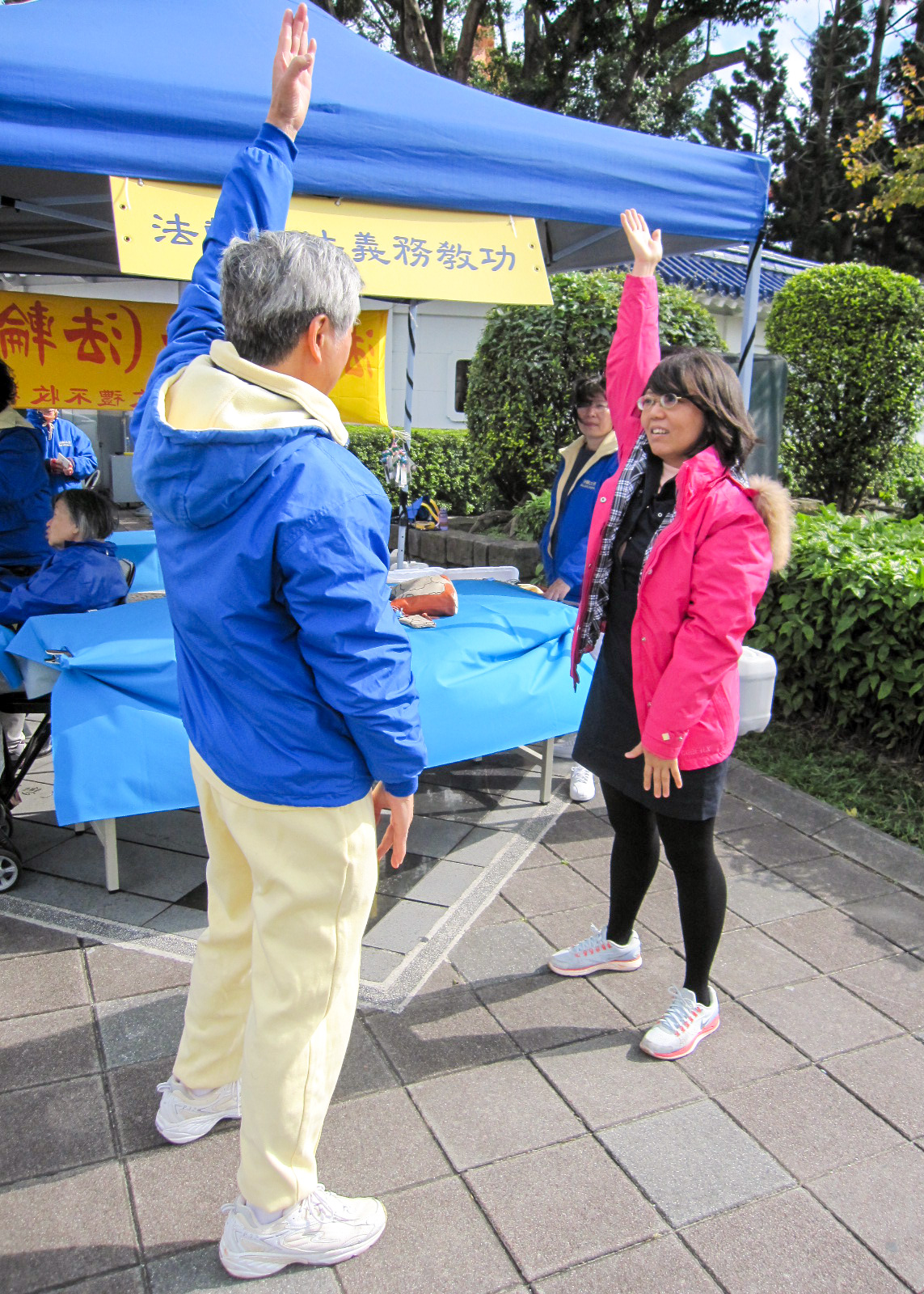 来自新店陈太太说:“我原先行走不便,有血压、血脂、血糖三高症候群,修炼三个月功法,现在走路健步,能跑能跳,整个人像脱胎换骨,我感到法轮大法很神奇。”她今天特地来,想把五套功法学炼一遍,将炼功动作调整准确。台北殷小姐由学员现场教功,她感到法轮功很正,使她更加坚定信心好好学炼。