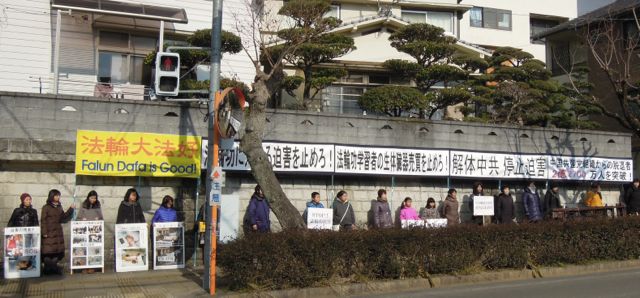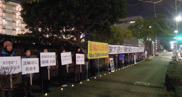二月七日下午二点到半夜十点,熊本地区的法轮功学员先后在长崎中领馆和福冈中领馆前,打开“法轮大法好”,“解体中共,停止迫害”,“立即停止对法轮功的迫害”,“立即停止对法轮功学员的活摘器官”,“退!党!人数突破两亿二千万”等横幅和“还法轮功自由”,“STOP!对法轮功的迫害”,“善恶必报”,“STOP!活摘器官”等真相标语牌以及真相展板抗议中共对法轮功长达十六年的迫害,并烛光悼念被中共迫害致死的中国大陆的法轮功学员。