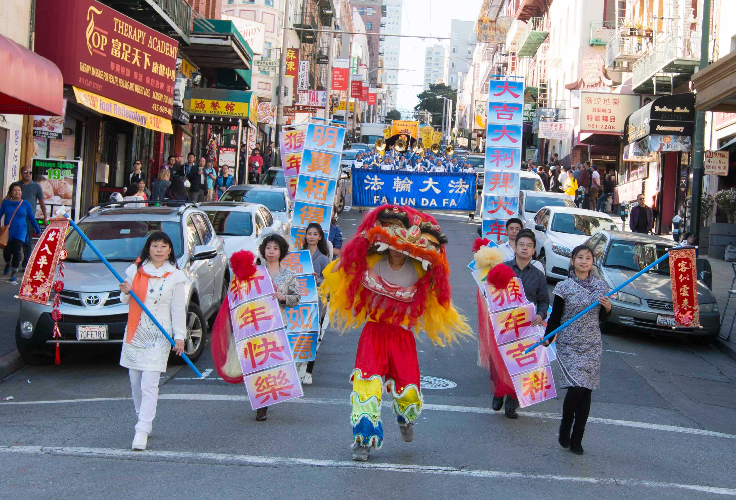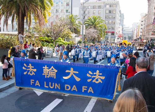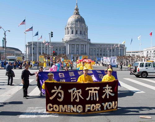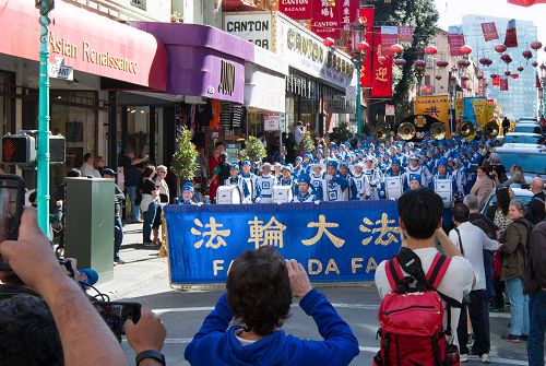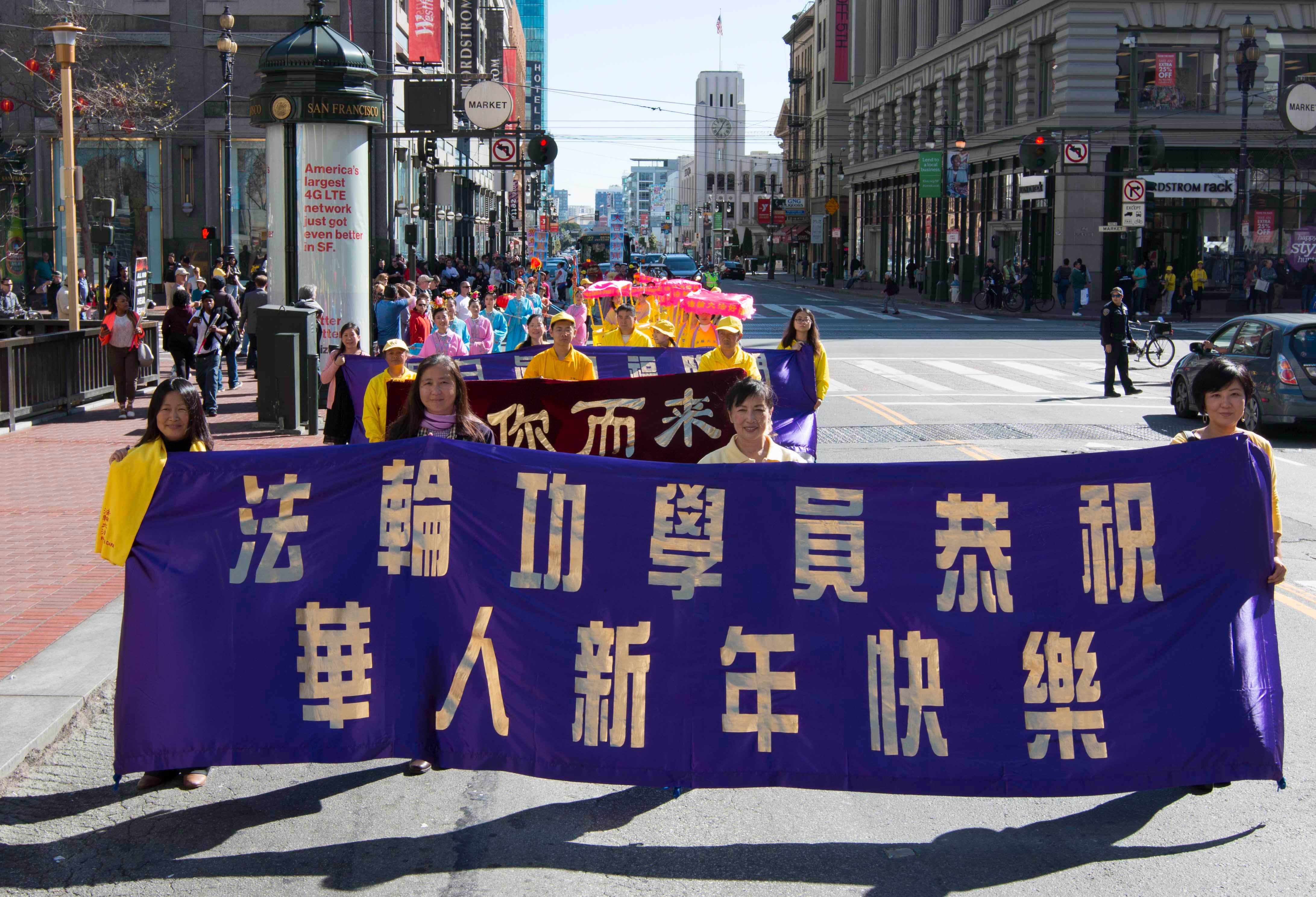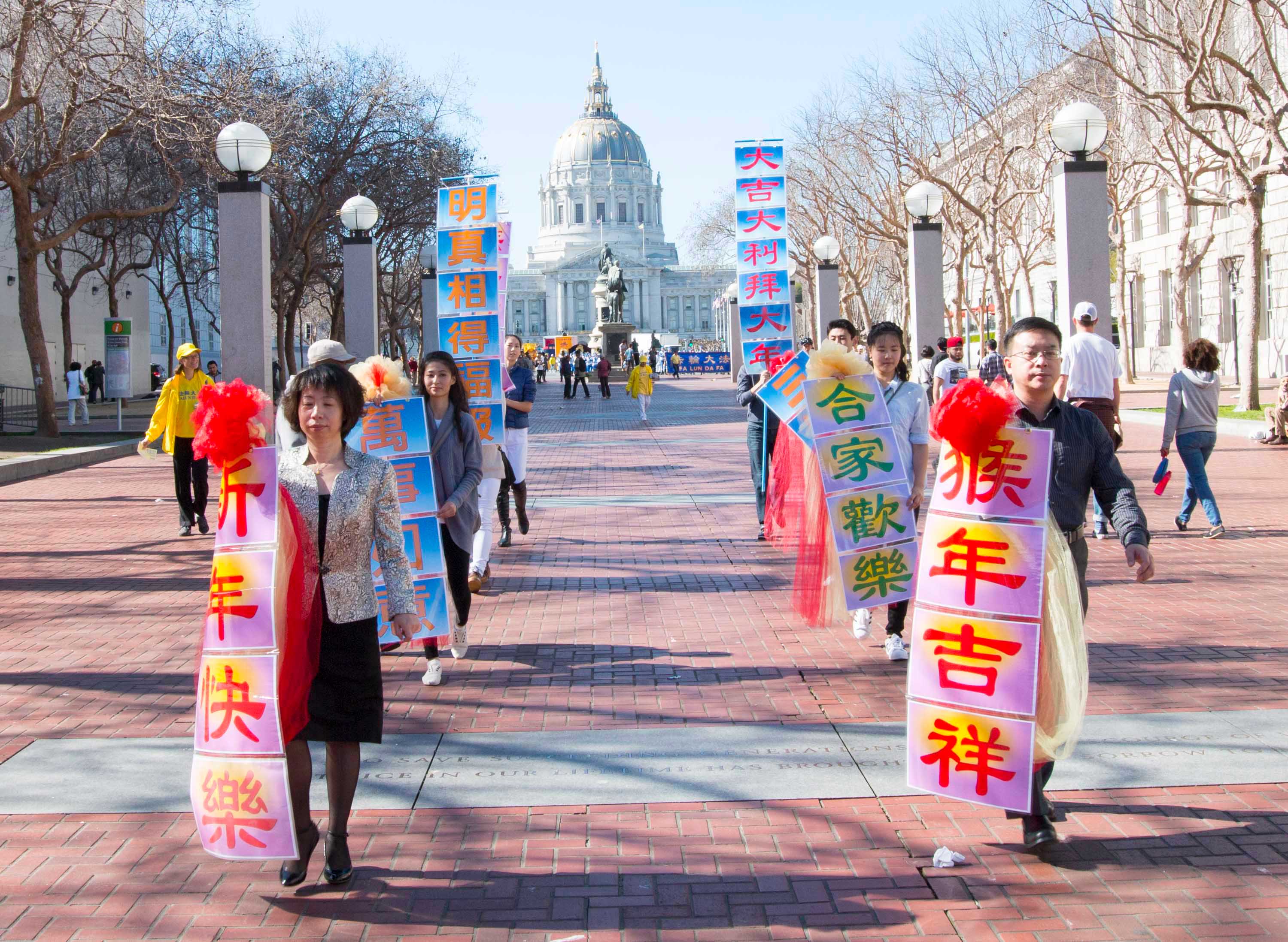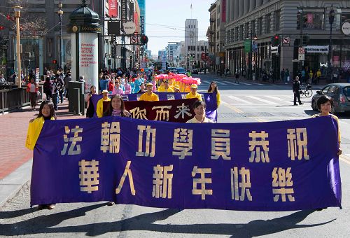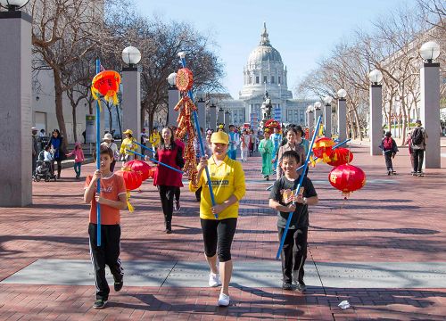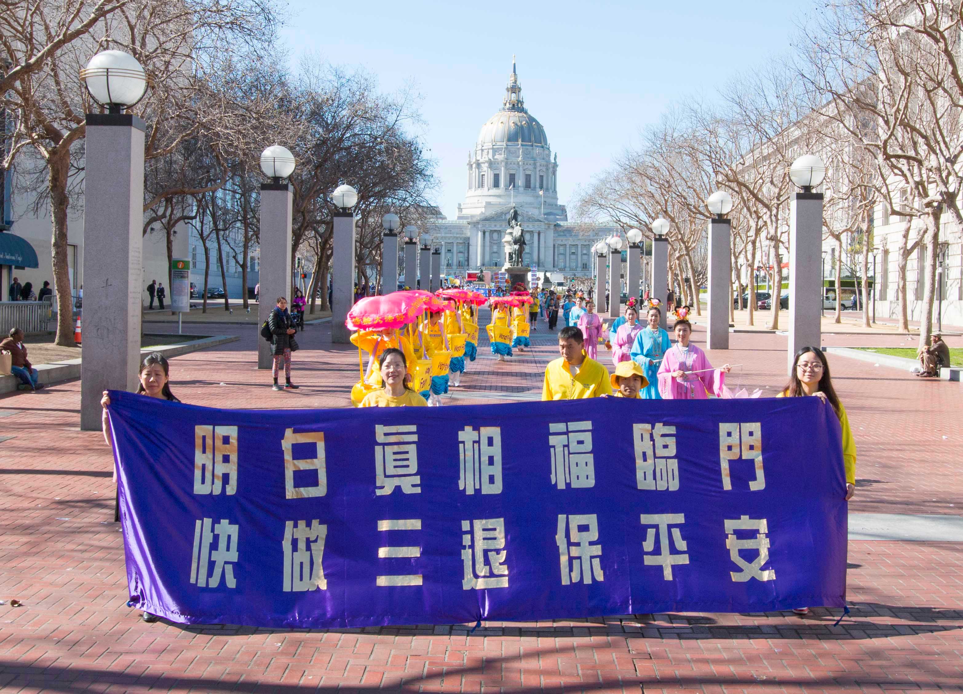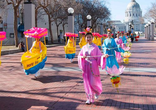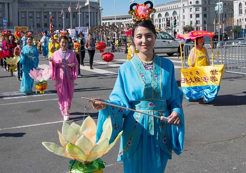 中午十二点,由旧金山法轮大法修炼者和支持者组成的游行队伍从旧金山市政府广场出发,走在最前面的是给华人拜年、身穿过年服装手提灯笼弘扬中华传统文化的仙女队和法轮功小弟子队。紧接在后的是身穿古装、阵容壮观的美西天国乐团,之后有旗队、法轮功功法展示队、·九·评*退!党!队、审江队和花车等。