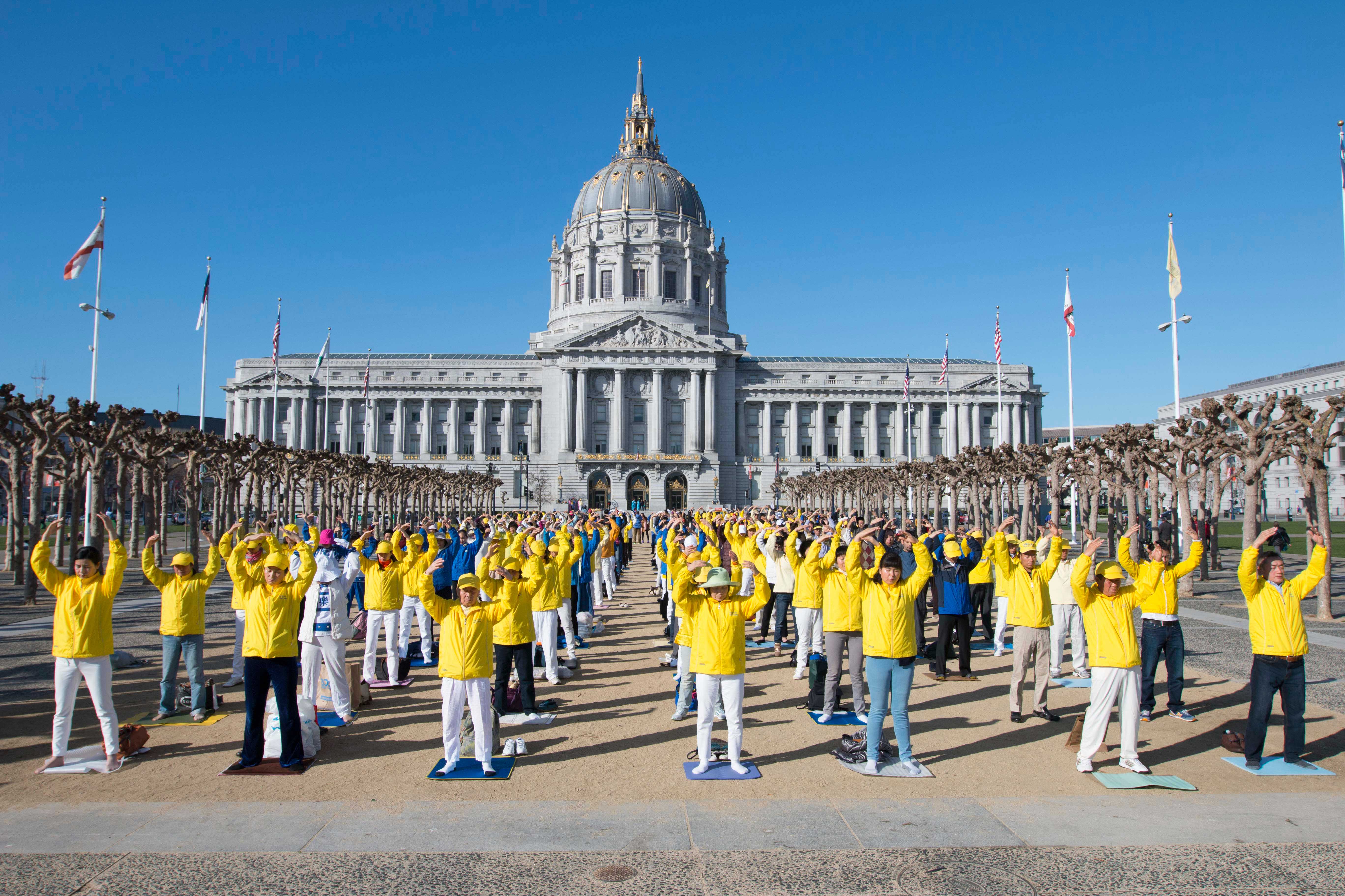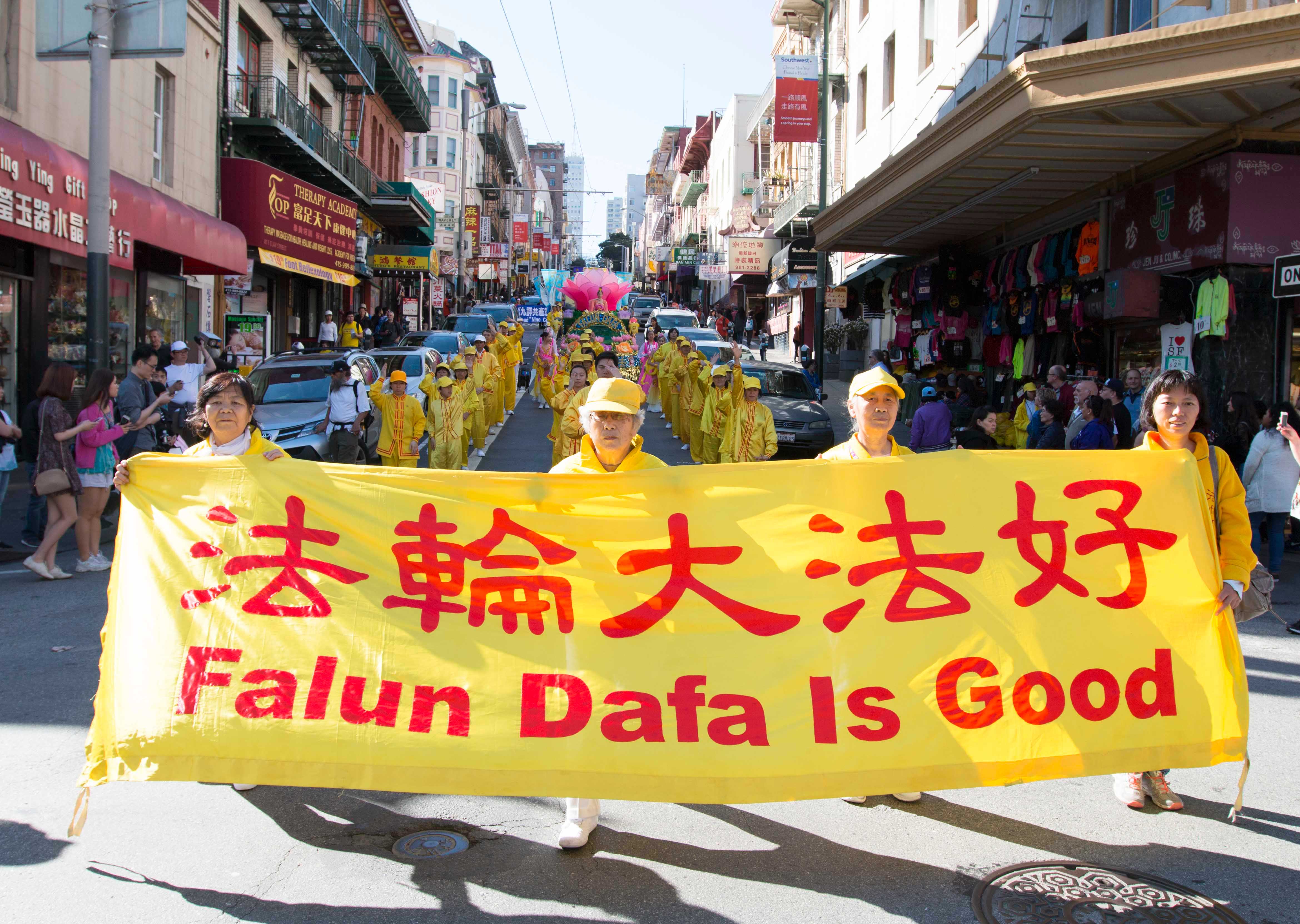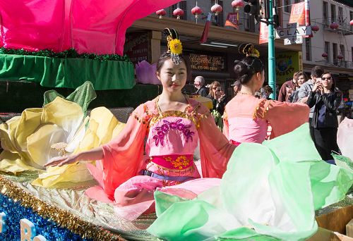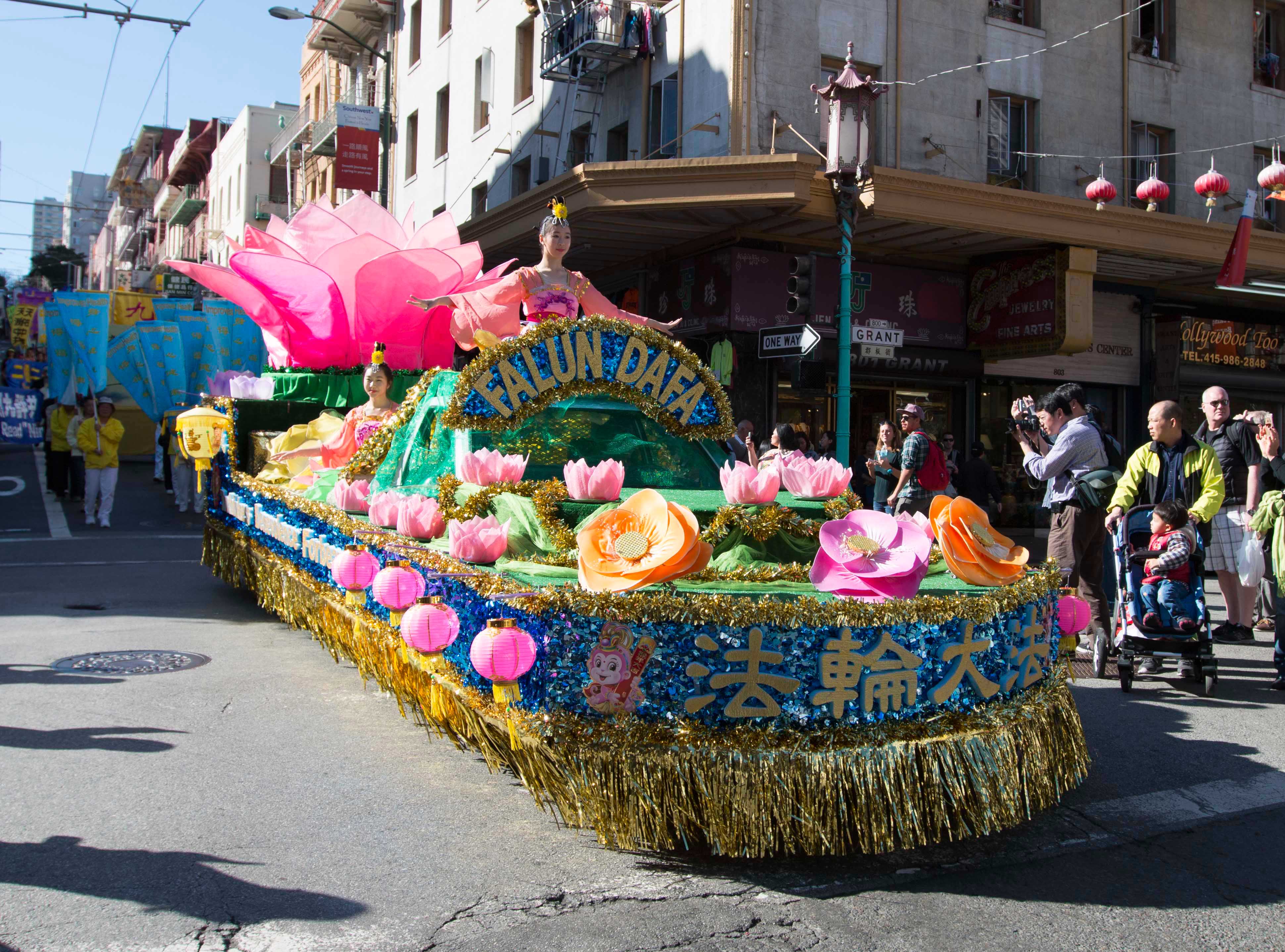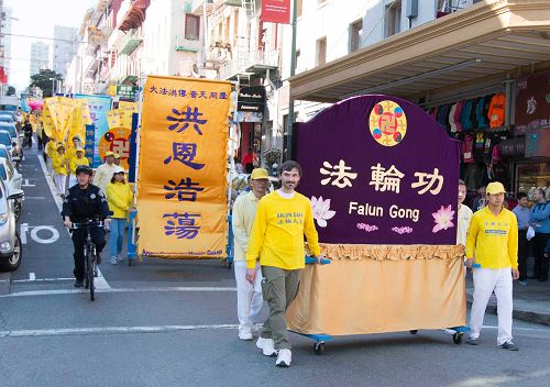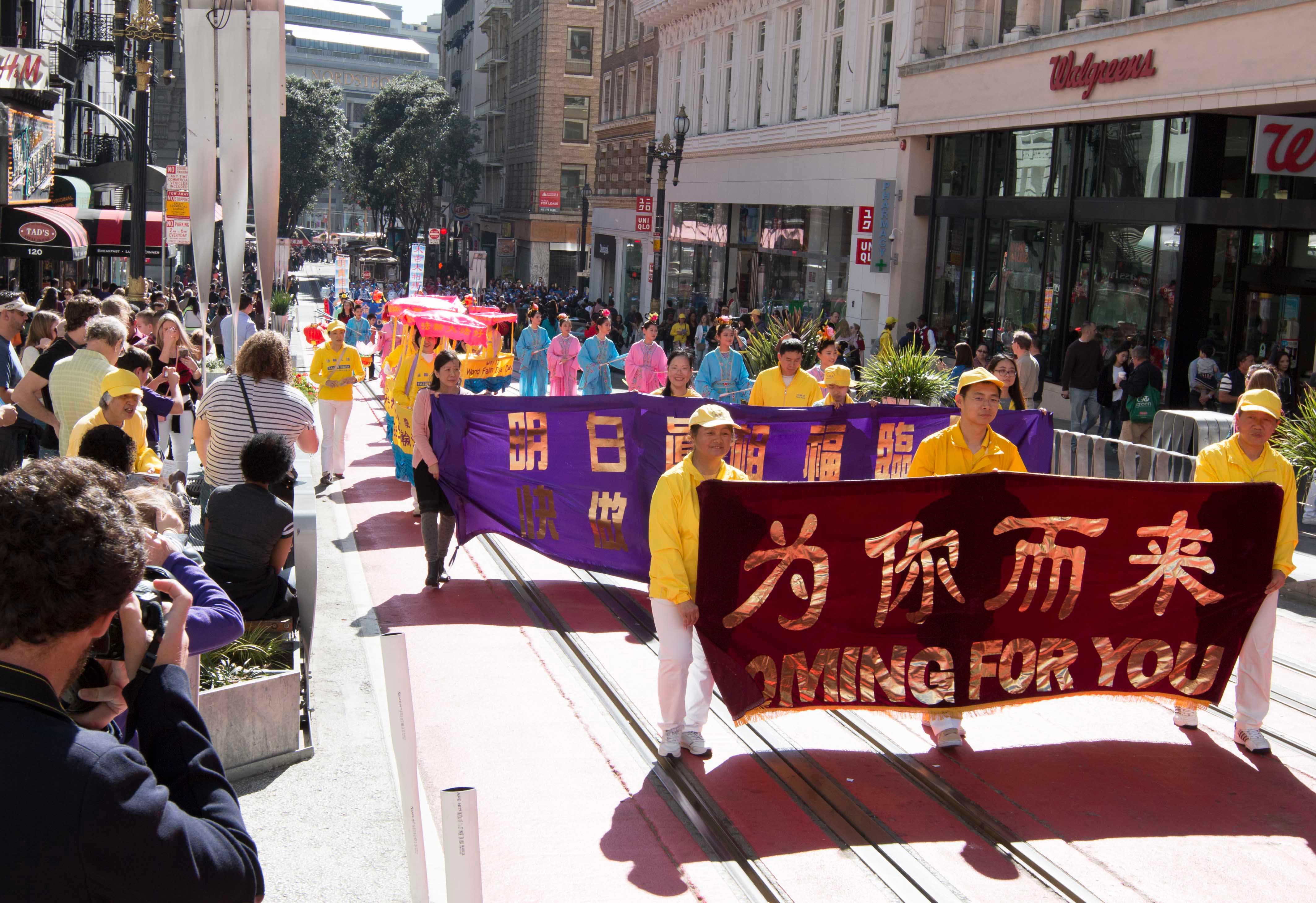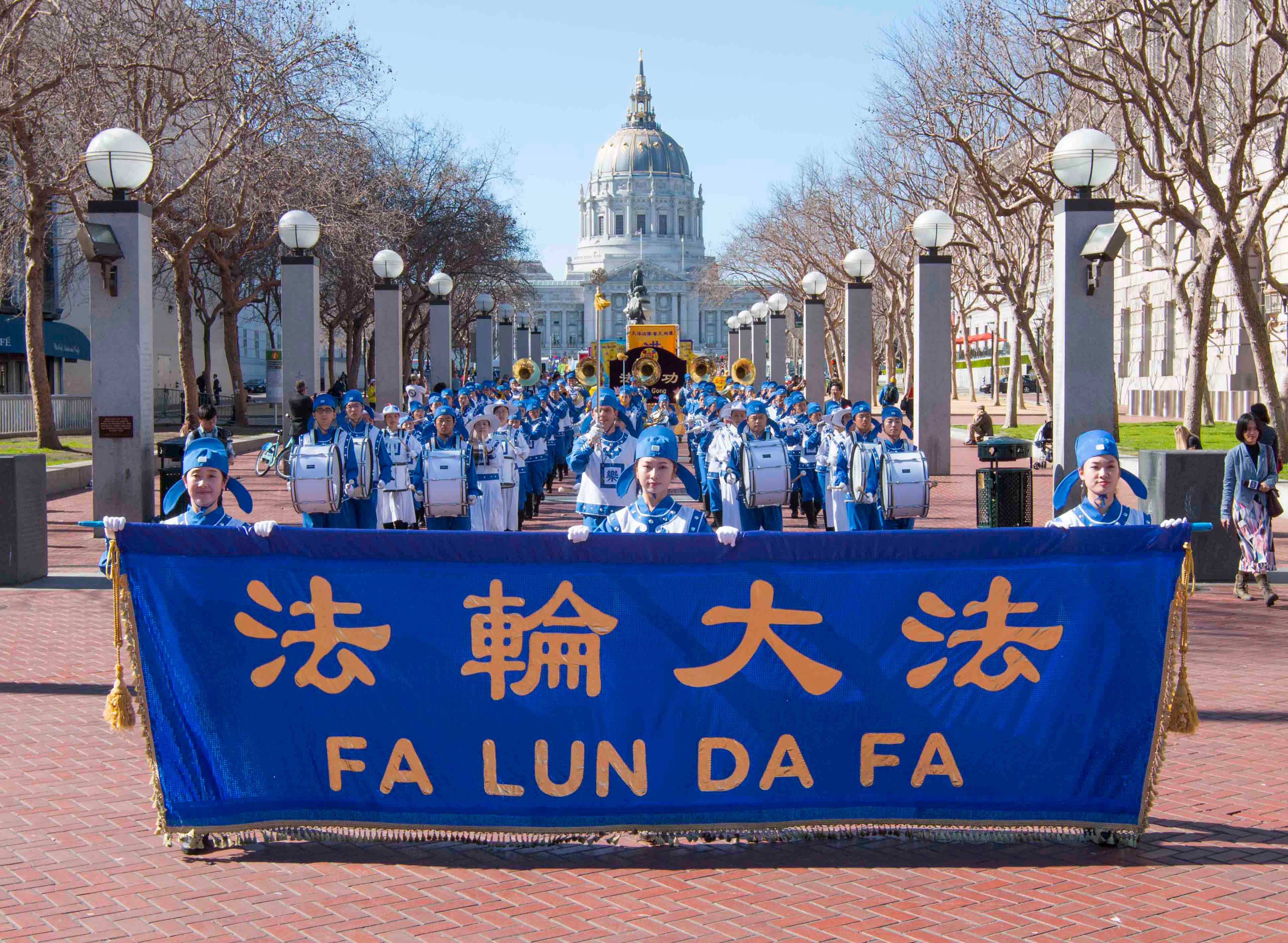 中午十二点,由旧金山法轮大法修炼者和支持者组成的游行队伍从旧金山市政府广场出发,走在最前面的是给华人拜年、身穿过年服装手提灯笼弘扬中华传统文化的仙女队和法轮功小弟子队。紧接在后的是身穿古装、阵容壮观的美西天国乐团,之后有旗队、法轮功功法展示队、·九·评*退!党!队、审江队和花车等。