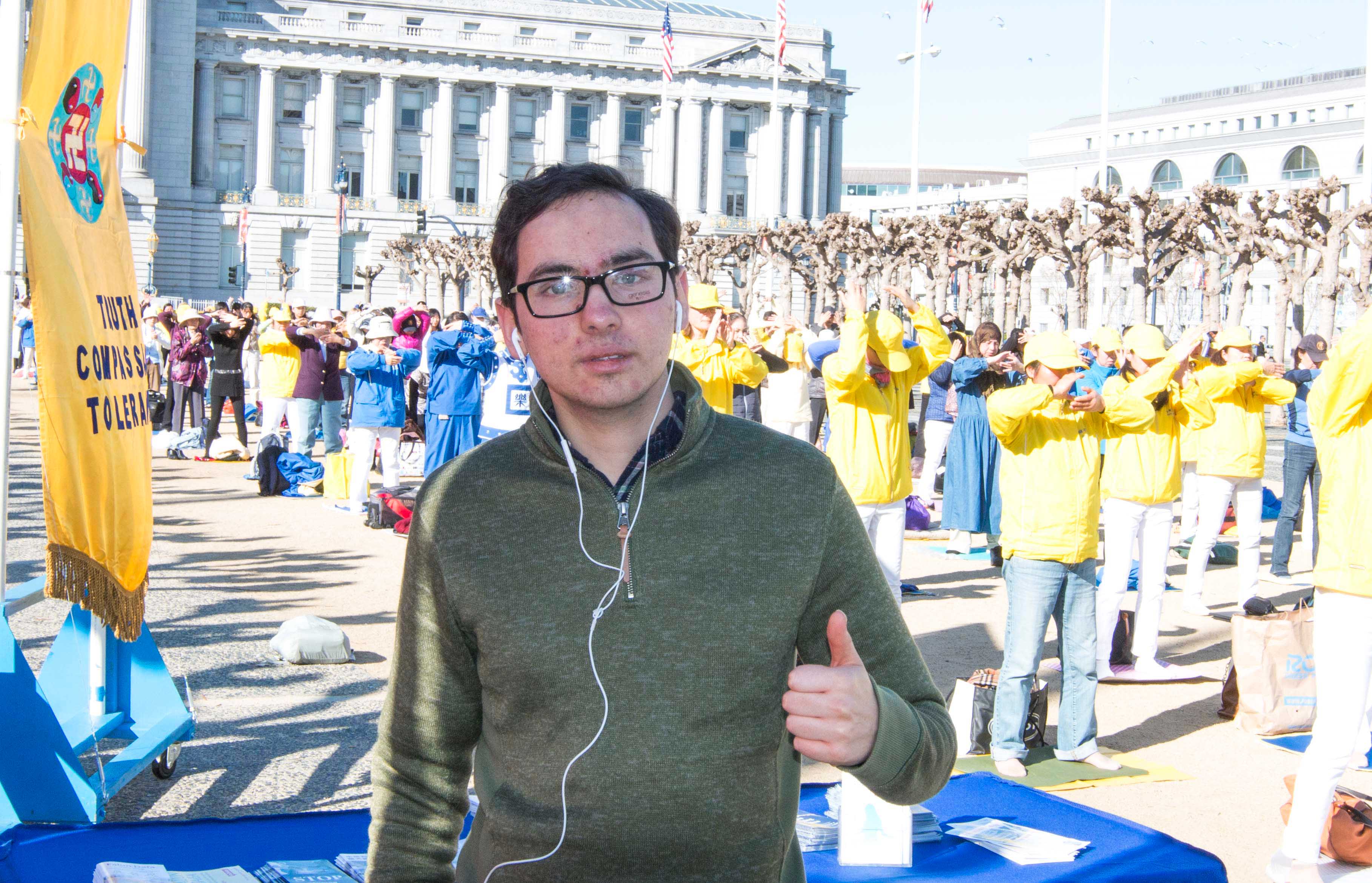 来自中国大陆的董先生来旧金山旅游正好赶上法轮功学员的活动。他被旧金山市政厅前的法轮功学员祥和的炼功场面所吸引,情不自禁拿起相机拍下了法轮功学员炼功的画面。他说,他经常在香港看到法轮功学员在香港移民中心前讲真相。他说:“我可以接受法轮功,因为大家都有自己的信仰,每个人都应该有自己选择的权利。”