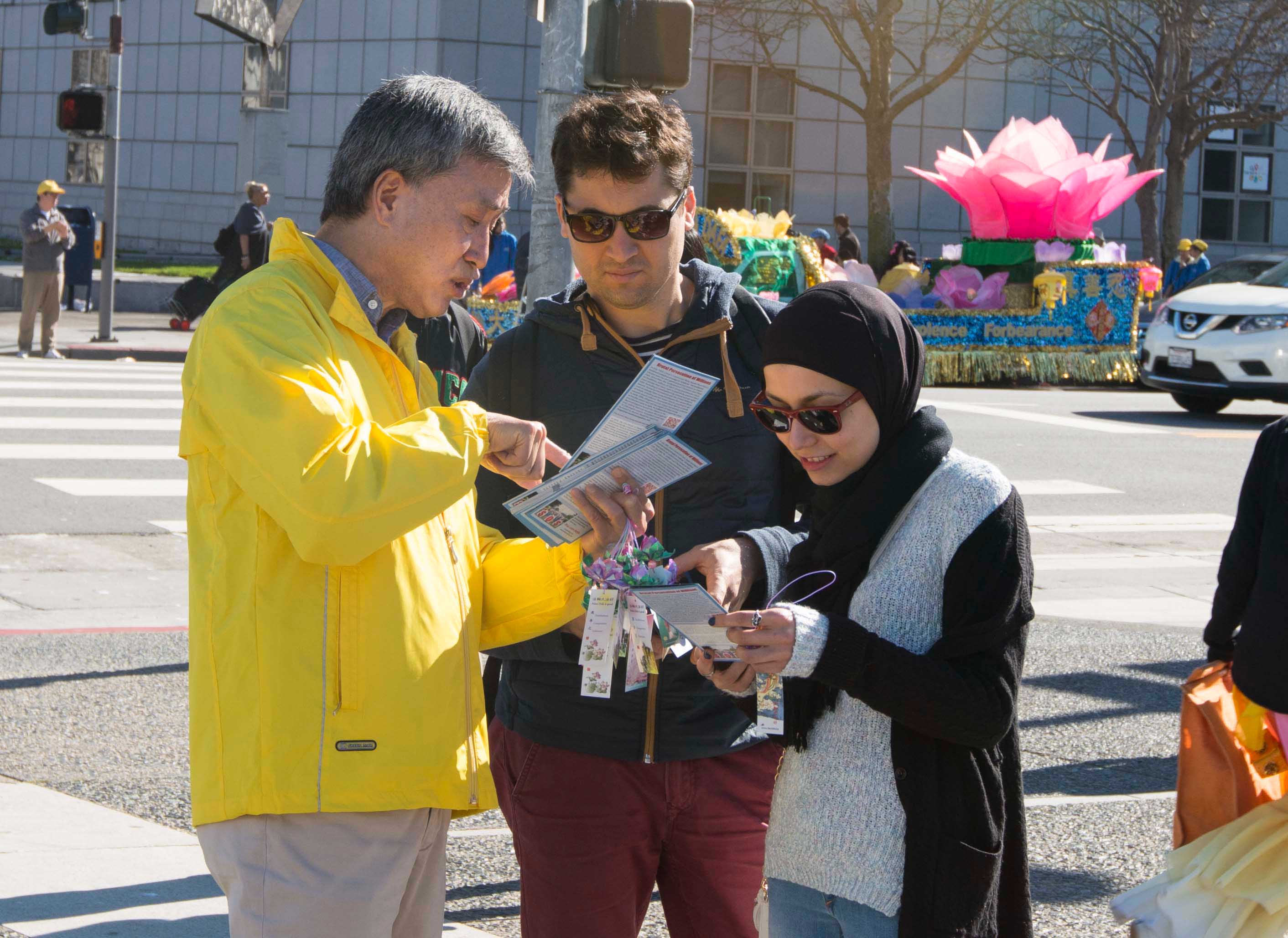 中国城的一位越南华侨,每年都来看法轮功学员的游行。他说,太好了,看到法轮功学员的游行队伍这么好,他已经在网上开始阅读法轮功的书籍。他说:“我支持你们。”