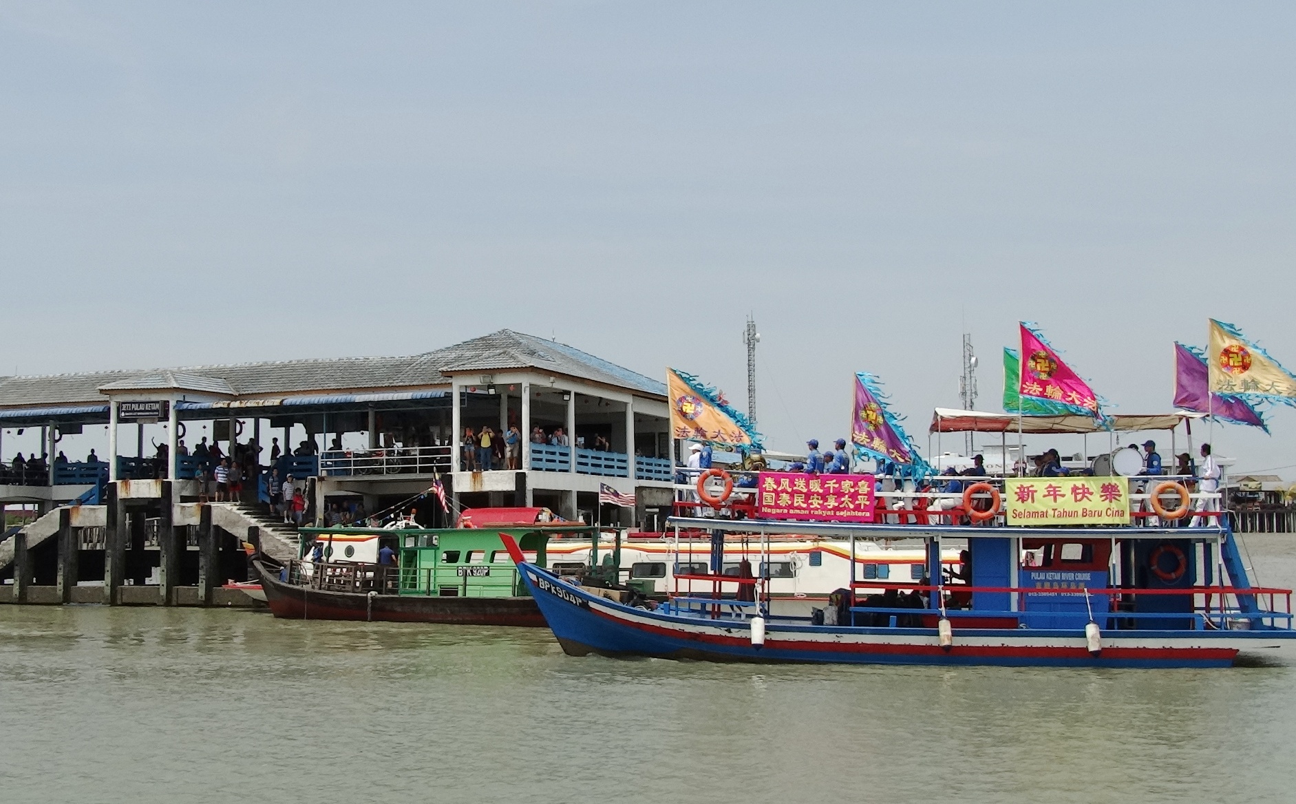 二月十三日下午一时,天国乐团团员乘上一艘主要以七彩缤纷的“法轮大法”旗子装饰的双层吉胆岛(Pulau Ketam)环岛游船,开始了当天的环岛演奏。在历时约一小时半的行程中,天国乐团环绕了吉胆岛沿岸两个人口密集的主要渔村,吉胆渔村和五条港渔村,向民众送上新年祝福。天国乐团演奏着一首接一首震撼人心、优美的乐曲,嘹亮的旋律传遍了吉胆岛的多个角落,增添了当地新年喜庆气氛。
