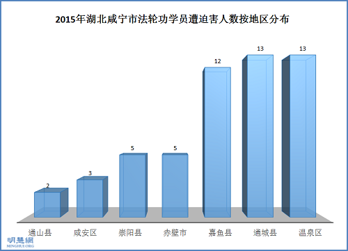 共计五十三人遭迫害,其中通城县十三人,崇阳县五人,通山县二人,温泉区十三人,咸安区三人,嘉鱼县十二人,赤壁市五人。还有在诉江过程中被骚扰的人数很多,无法统计。由于各种原因所造成的信息传递不便,实际被迫害人数不止于此。