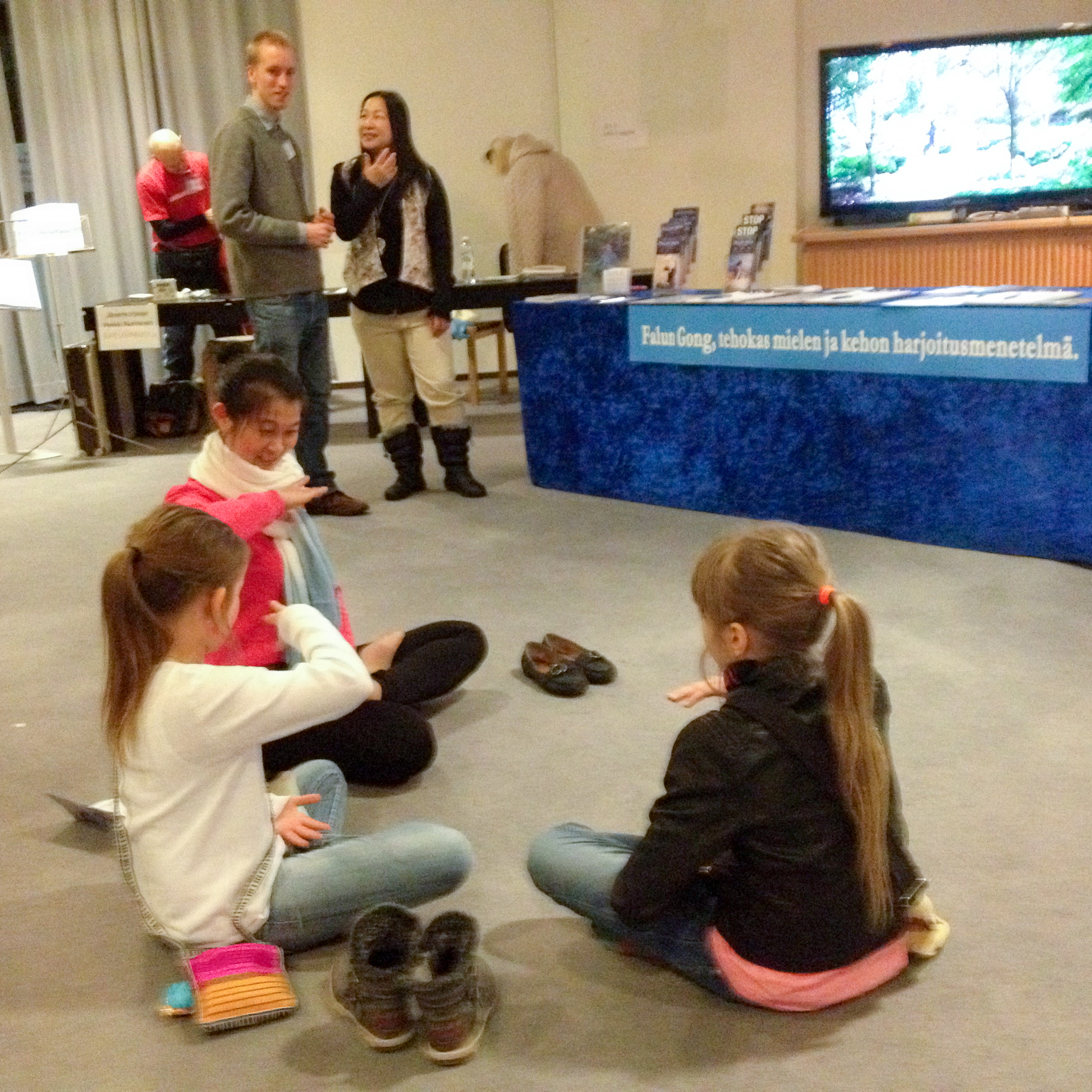 其中有一位芬兰的年轻母亲带着一对双胞胎女孩走到展位前,当该女士了解真相后,毫不犹豫地签名支持诉江的活动。而那两位女孩却被大屏幕中李洪志老师教学员功法的画面所吸引,看了一会儿才跟其母亲离开。大约半小时候,这两位小女孩又走回到征签台前,跟着学员认认真真地学起五套功法,期间周围多位途经的参展者被她们的纯真所渲染,随之更多的人们停下细看学员的五套功法展示;活动期间,不断有感兴趣的人们加入学功的行列。