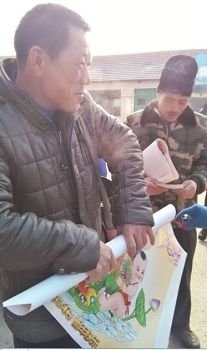 在一个商店门口,法轮功学员发明慧年画,正赶上一帮扭秧歌的老太太,人人都来要年画,真的抢了起来。有个人还拽着一个没“三:退.”的熟人不让走,让法轮功学员赶紧给记名三:退.。