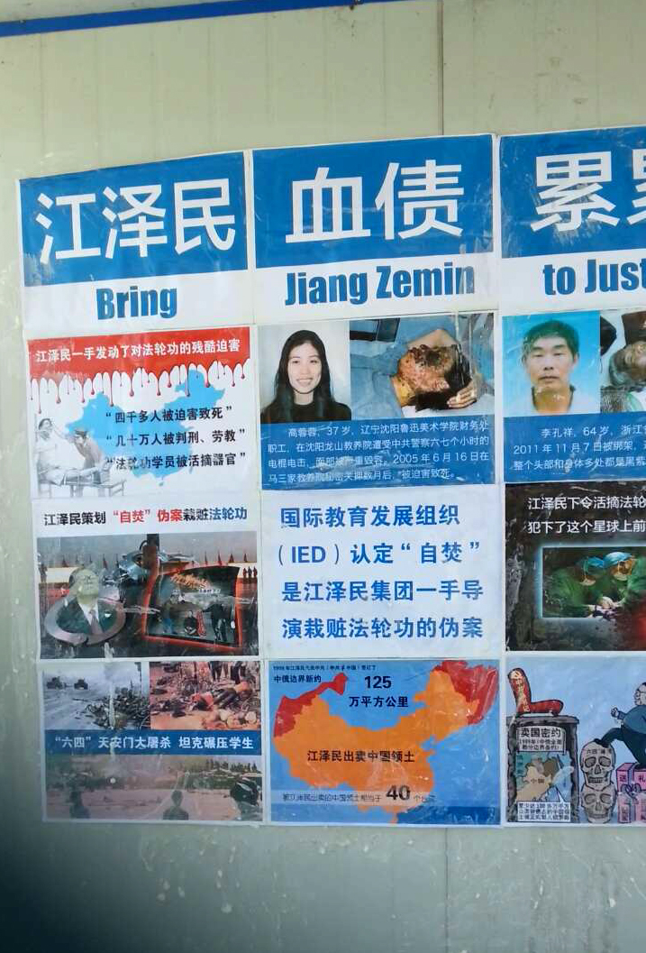 近日,黑龙江省哈尔滨市街头巷尾、公园、路边出现了许多法轮功真相展板。在路边、公园、社区等大树上、高楼上、桥上悬挂着法办元凶江泽民、将江泽民绳之以法、停止对法轮功的迫害等条幅。前几天,气温回升,多处可见江泽民罪行的不干胶。