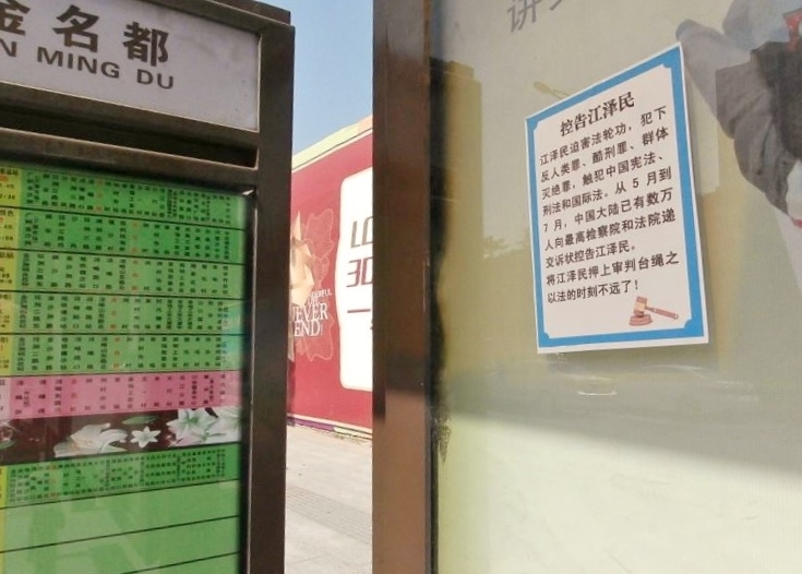 初九那天,我们在市内巡视了一圈,大街小巷和公告栏上的粘贴虽历经几次狂风暴雨,但“二十万人控告江泽民”、“全球人民支持控告江泽民”等字依然醒目,鼓舞着人心。