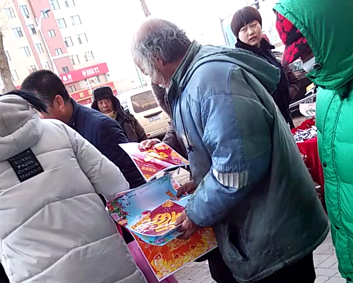 我们选用的年画和福字都是明慧发表的法轮大法好或真善忍好字样醒目的,每次发放时,都有百姓高呼:“法轮大法好!真善忍好!法轮大法就是好!”有的领走一份又回来多要一份给孩子,也有周边做买卖的,直接把大法真相年画和福字摆在摊床上。